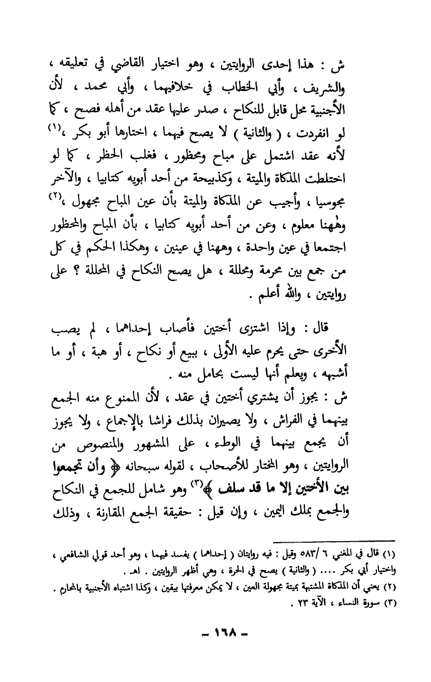 ش: هذا إحدى الروايتين، وهو اختيار القاضي في تعليقه، والشريف، وأبي الخطاب في خلافيهما، وأبي محمد، لأن الأجنبية محل قابل للنكاح، صدر عليها عقد من أهله فصح، كما لو انفردت، (والثانية) لا يصح فيهما، اختارها أبو بكر، لأنه عقد اشتمل على مباح ومحظور، فغلب الحظر، كما لو اختلطت المذكاة والميتة، وكذبيحة من أحد أبويه كتابيا، والآخر مجوسيا وأجيب عن المذكاة والميتة بأن عين المباح مجهول، وهاهنا معلوم، وعن من أحد أبويه كتابيا، بأن المباح والمحظور اجتمعا في عين واحدة، وها هنا في عينين، وهكذا الحكم في كل من جمع بين محرمة ومحللة، هل يصح النكاح في المحللة؟ على روايتين، والله أعلم.