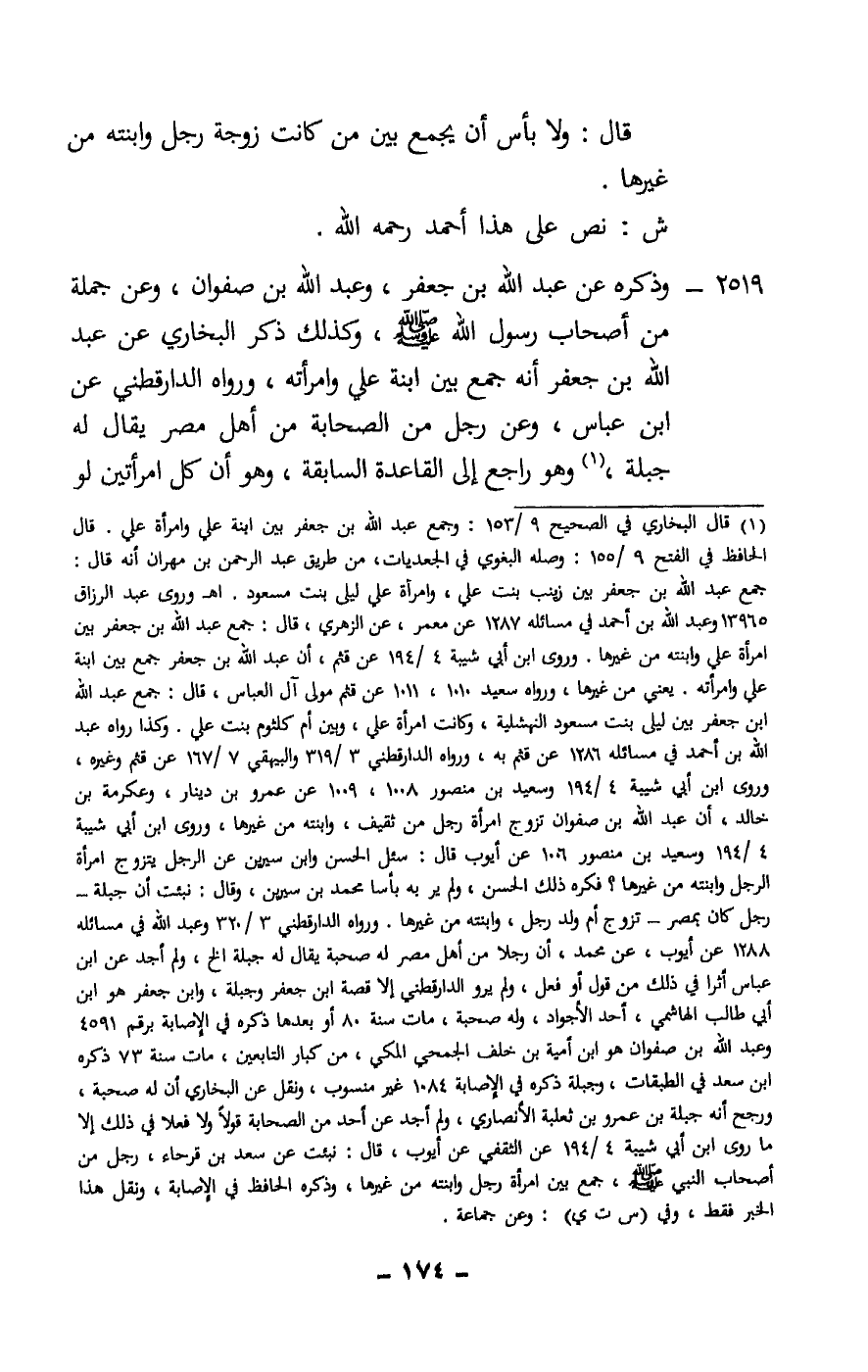 2519 - وذكره عن عبد الله بن جعفر، وعبد الله بن صفوان، وعن جملة من أصحاب رسول الله - صَلَّى اللَّهُ عَلَيْهِ وَسَلَّمَ - وكذلك ذكر البخاري عن عبد الله بن جعفر أنه جمع بين ابنة علي وامرأته، ورواه الدارقطني عن ابن عباس، وعن رجل من الصحابة من أهل مصر يقال له جبلة، وهو راجع إلى القاعدة السابقة، وهو أن كل امرأتين لو