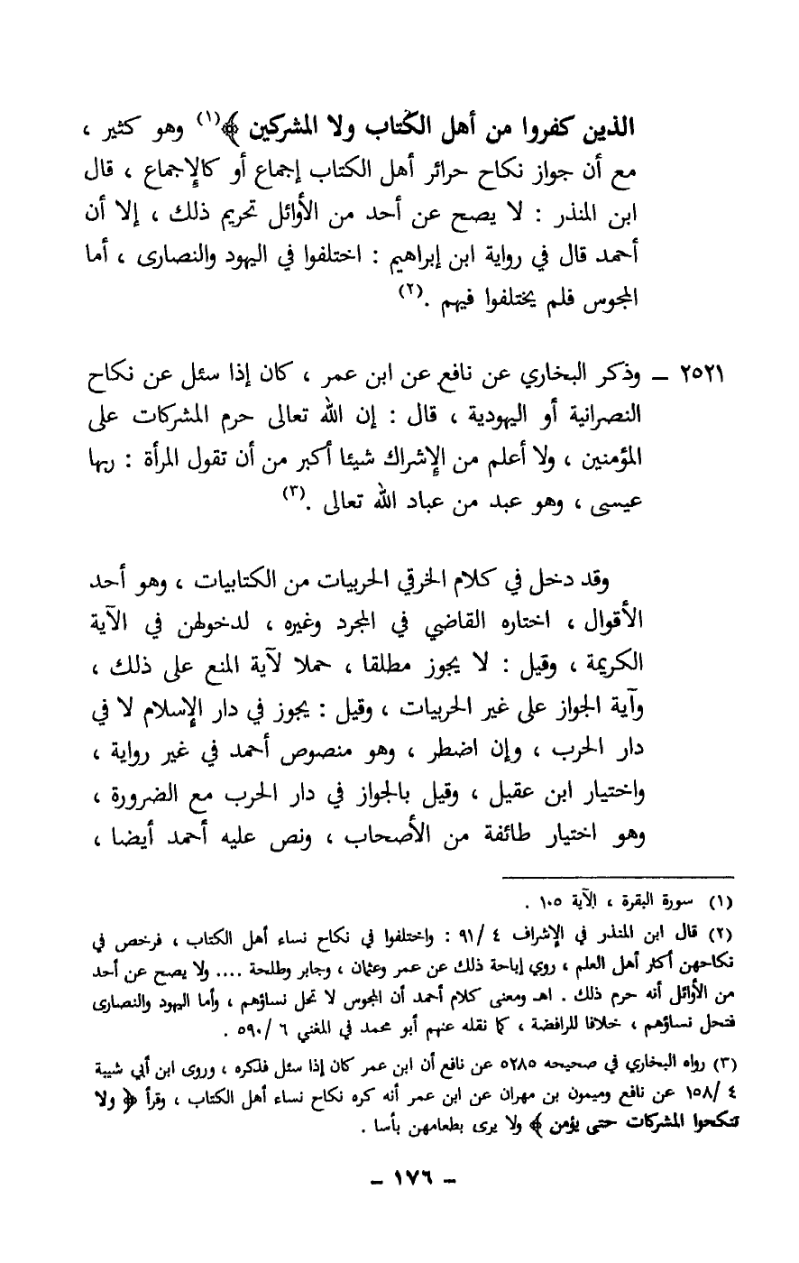 2521 - وذكر البخاري عن نافع عن ابن عمر، كان إذا سئل عن نكاح النصرانية أو اليهودية، قال: إن الله تعالى حرم المشركات على المؤمنين، ولا أعلم من الإشراك شيئا أكبر من أن تقول المرأة: ربها عيسى، وهو عبد من عباد الله تعالى.