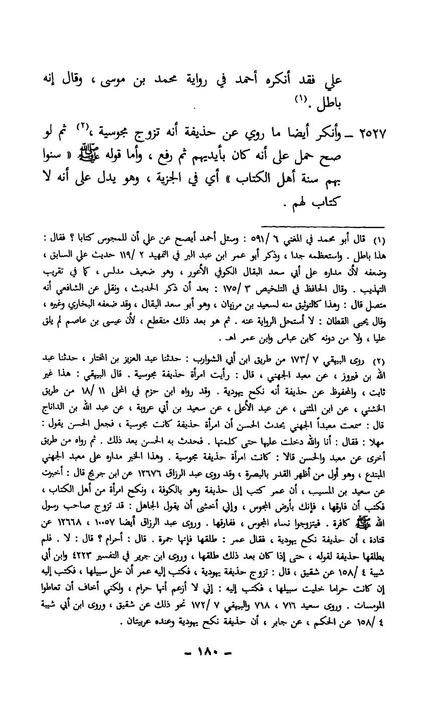 2527 - وأنكر أيضا ما روي عن حذيفة أنه تزوج مجوسية، ثم لو صح حمل على أنه كان بأيديهم ثم رفع، وأما قوله - صَلَّى اللَّهُ عَلَيْهِ وَسَلَّمَ -: «سنوا بهم سنة أهل الكتاب» أي في الجزية، وهو يدل على أنه لا كتاب لهم.