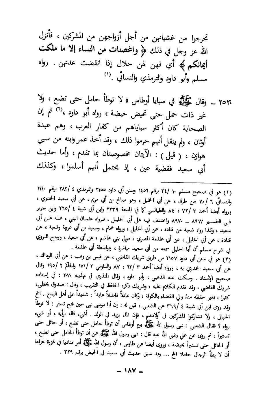2530 - وقال - صَلَّى اللَّهُ عَلَيْهِ وَسَلَّمَ - في سبايا أوطاس «لا توطأ حامل حتى تضع، ولا غير ذات حمل حتى تحيض حيضة» رواه أبو داود، ثم إن الصحابة كان أكثر سباياهم من كفار العرب، وهم عبدة أوثان، ولم ينقل أنهم حرموا ذلك، وقد أخذ عمر وابنه من سبي هوازن، (قيل) : الآيتان مخصوصتان بما تقدم، وأما حديث أبي سعيد فقضية عين، إذ يحتمل أنهم أسلموا، وكذلك