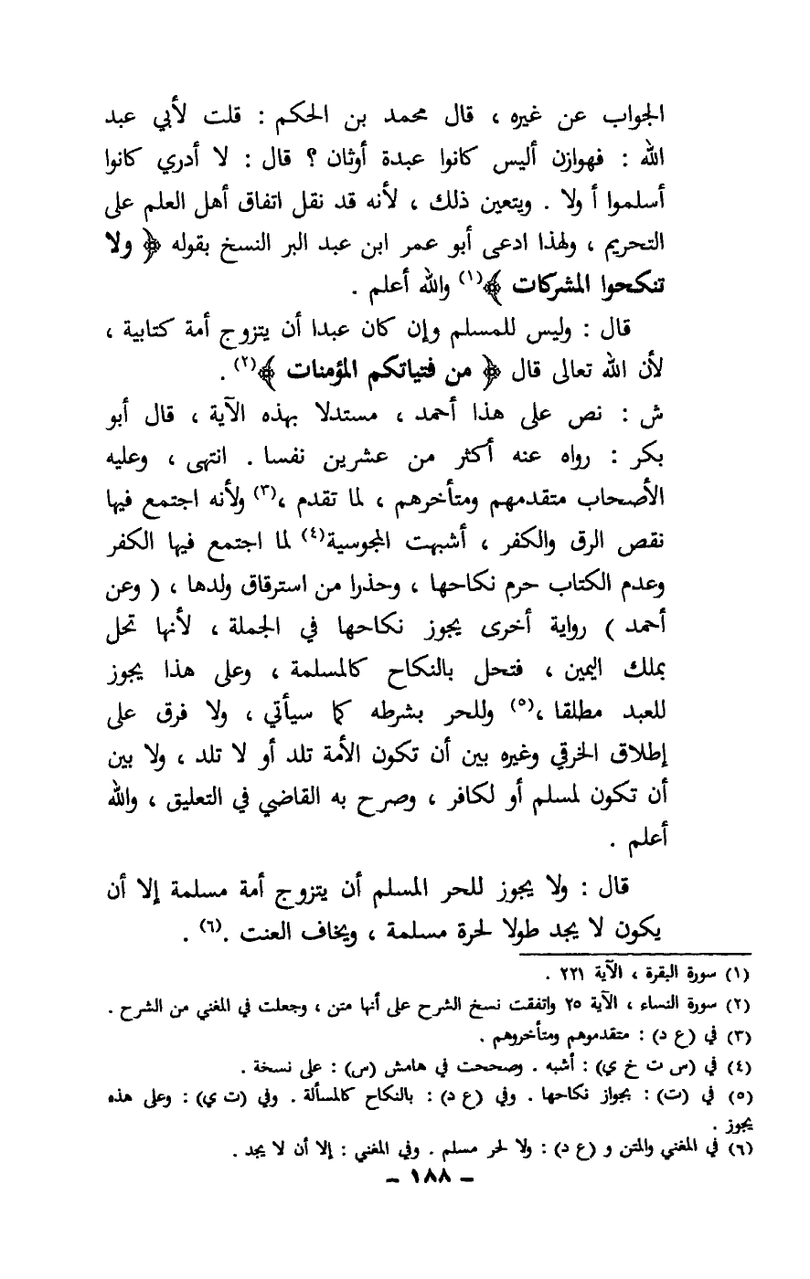 ش: نص على هذا أحمد، مستدلا بهذه الآية، قال أبو بكر: رواه عنه أكثر من عشرين نفسا. انتهى، وعليه الأصحاب متقدمهم ومتأخرهم، لما تقدم، ولأنه اجتمع فيها نقص الرق والكفر، أشبهت المجوسية لما اجتمع فيها الكفر وعدم الكتاب حرم نكاحها، وحذرا من استرقاق ولدها، (وعن أحمد) رواية أخرى يجوز نكاحها في الجملة، لأنها تحل بملك اليمين، فتحل بالنكاح كالمسلمة، وعلى هذا يجوز للعبد مطلقا، وللحر بشرطه كما سيأتي، ولا فرق على إطلاق الخرقي وغيره بين أن تكون الأمة تلد أو لا تلد، ولا بين أن تكون لمسلم أو لكافر، وصرح به القاضي في التعليق، والله أعلم.