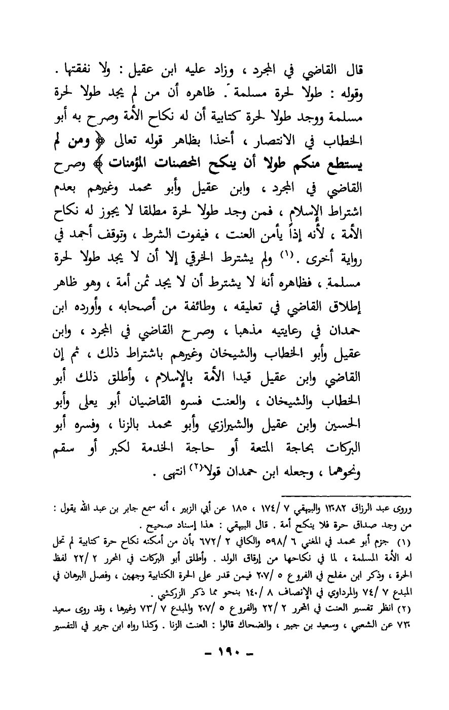 قال القاضي في المجرد، وزاد عليه ابن عقيل: ولا نفقتها. وقوله: طولا لحرة مسلمة. ظاهره أن من لم يجد طولا لحرة مسلمة ووجد طولا لحرة كتابية أن له نكاح الأمة وصرح به أبو الخطاب في الانتصار، أخذا بظاهر قَوْله تَعَالَى: {وَمَنْ لَمْ يَسْتَطِعْ مِنْكُمْ طَوْلًا أَنْ يَنْكِحَ الْمُحْصَنَاتِ الْمُؤْمِنَاتِ} [النساء: 25] وصرح القاضي في المجرد، وابن عقيل وأبو محمد وغيرهم بعدم اشتراط الإسلام، فمن وجد طولا لحرة مطلقا لا يجوز له نكاح الأمة، لأنه إذا يأمن العنت، فيفوت الشرط، وتوقف أحمد في رواية أخرى. ولم يشترط الخرقي إلا أن لا يجد طولا لحرة مسلمة، فظاهره أنه لا يشترط أن لا يجد ثمن أمة، وهو ظاهر إطلاق القاضي في تعليقه، وطائفة من أصحابه، وأورده ابن حمدان في رعايتيه مذهبا، وصرح القاضي في المجرد، وابن عقيل وأبو الخطاب والشيخان وغيرهم باشتراط ذلك، ثم إن القاضي وابن عقيل قيدا الأمة بالإسلام، وأطلق ذلك أبو الخطاب والشيخان، والعنت فسره القاضيان أبو يعلى وأبو الحسين وابن عقيل والشيرازي وأبو محمد بالزنا، وفسره أبو البركات بحاجة المتعة أو حاجة الخدمة لكبر أو سقم ونحوهما، وجعله ابن حمدان قولا انتهى.