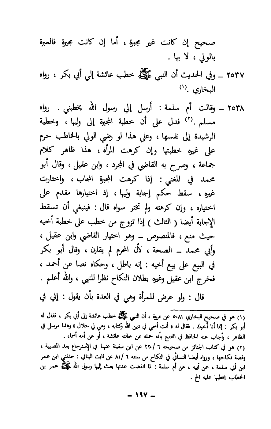 2538 - «وقالت أم سلمة: أرسل إلي رسول الله - صَلَّى اللَّهُ عَلَيْهِ وَسَلَّمَ - يخطبني» . رواه مسلم. فدل على أن خطبة المجبرة إلى وليها، وخطبة الرشيدة إلى نفسها، وعلى هذا لو رضي الولي بالخاطب حرم على غيره خطبتها وإن كرهت المرأة، هذا ظاهر كلام جماعة، وصرح به القاضي في المجرد، وابن عقيل، وقال أبو محمد في المغني: إذا كرهت المجبرة المجاب، واختارت غيره، سقط حكم إجابة وليها، إذ اختيارها مقدم على اختياره، وإن كرهته ولم تختر سواه قال: فينبغي أن تسقط الإجابة أيضا (الثالث) إذا تزوج من خطب على خطبة أخيه حيث منع، فالمنصوص - وهو اختيار القاضي وابن عقيل، وأبي محمد - الصحة، لأن المحرم لم يقارن، وقال أبو بكر في البيع على بيع أخيه: إنه باطل، وحكاه نصا عن أحمد، فخرج ابن عقيل وغيره بطلان النكاح نظرا للنهي، والله أعلم.