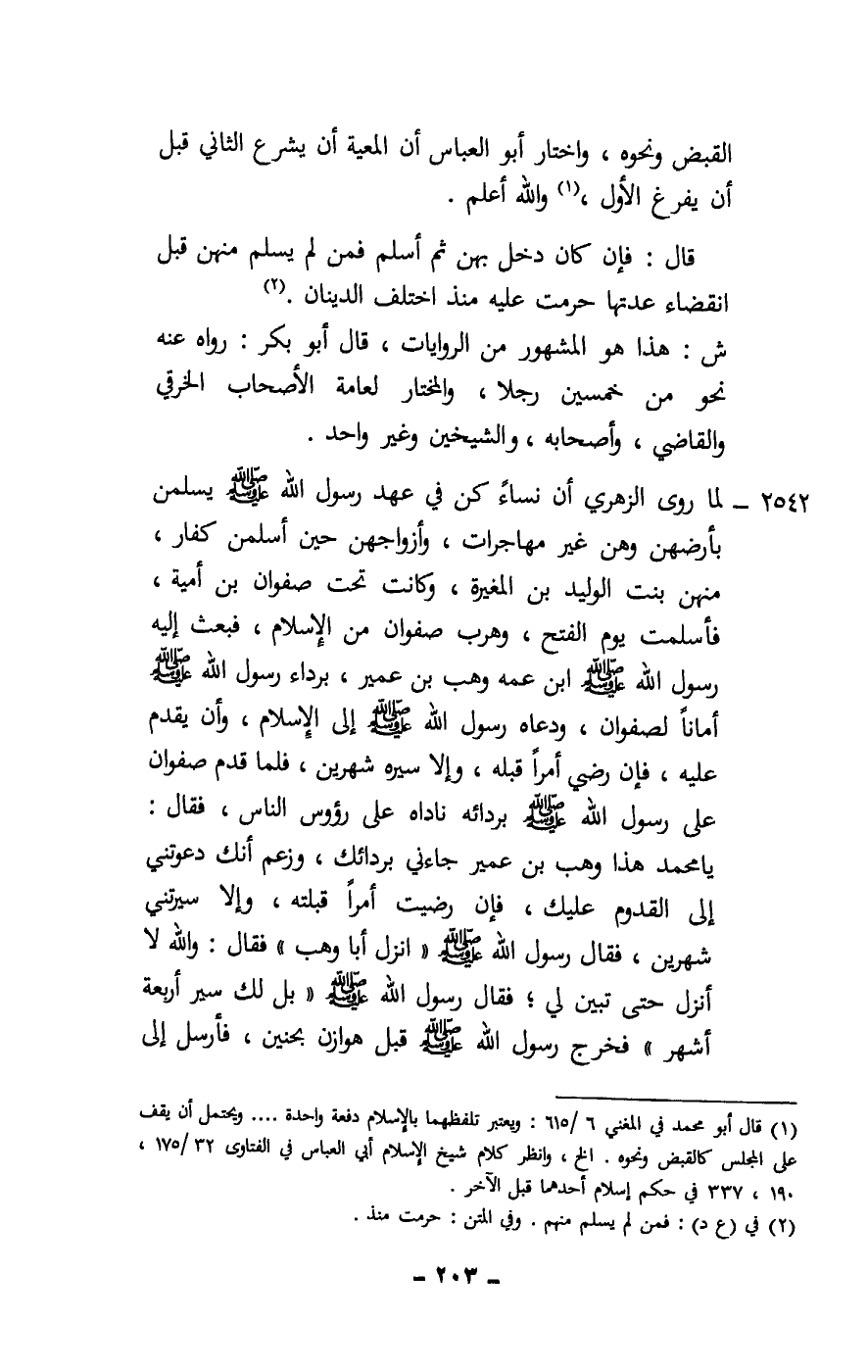 2542 - لما «روى الزهري أن نساء كن في عهد رسول الله - صَلَّى اللَّهُ عَلَيْهِ وَسَلَّمَ - يسلمن بأرضهن وهن غير مهاجرات، وأزواجهن حين أسلمن كفار، منهن بنت الوليد بن المغيرة، وكانت تحت صفوان بن أمية، فأسلمت يوم الفتح، وهرب صفوان من الإسلام، فبعث إليه رسول الله - صَلَّى اللَّهُ عَلَيْهِ وَسَلَّمَ - ابن عمه وهب بن عمير، برداء رسول الله - صَلَّى اللَّهُ عَلَيْهِ وَسَلَّمَ - أمانا لصفوان، ودعاه رسول الله - صَلَّى اللَّهُ عَلَيْهِ وَسَلَّمَ - إلى الإسلام، وأن يقدم عليه، فإن رضي أمرا قبله، وإلا سيره شهرين، فلما قدم صفوان على رسول الله - صَلَّى اللَّهُ عَلَيْهِ وَسَلَّمَ - بردائه ناداه على رؤوس الناس، فقال: يا محمد هذا وهب بن عمير جاءني بردائك، وزعم أنك دعوتني إلى القدوم عليك، فإن رضيت أمرا قبلته، وإلا سيرتني شهرين، فقال رسول الله - صَلَّى اللَّهُ عَلَيْهِ وَسَلَّمَ -: «انزل أبا وهب» فقال: والله لا أنزل حتى تبين لي؛ فقال رسول الله - صَلَّى اللَّهُ عَلَيْهِ وَسَلَّمَ -: «بل لك سير أربعة أشهر» فخرج رسول الله - صَلَّى اللَّهُ عَلَيْهِ وَسَلَّمَ - قبل هوازن بحنين، فأرسل إلى