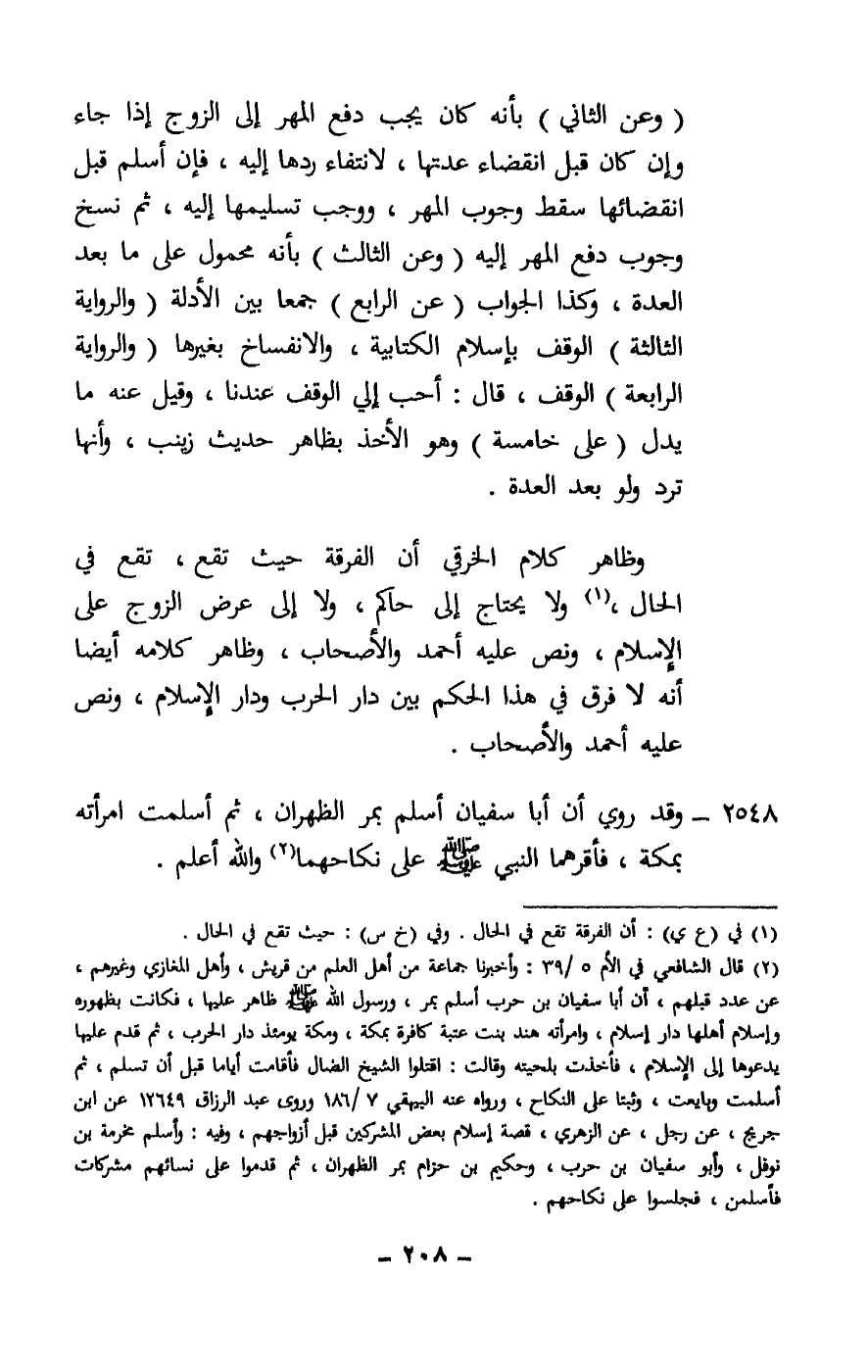 (وعن الثاني) بأنه كان يجب دفع المهر إلى الزوج إذا جاء وإن كان قبل انقضاء عدتها، لانتفاء ردها إليه، فإن أسلم قبل انقضائها سقط وجوب المهر، ووجب تسليمها إليه، ثم نسخ وجوب دفع المهر إليه (وعن الثالث) بأنه محمول على ما بعد العدة، وكذا الجواب (عن الرابع) جمعا بين الأدلة (والرواية الثالثة) الوقف بإسلام الكتابية، والانفساخ بغيرها (والرواية الرابعة) الوقف، قال: أحب إلي الوقف عندنا، وقيل عنه ما يدل (على خامسة) وهو الأخذ بظاهر حديث زينب، وأنها ترد ولو بعد العدة.