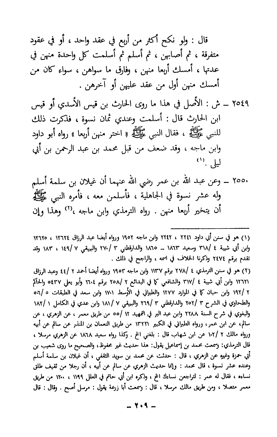 2549 - ش: الأصل في هذا ما «روى الحارث بن قيس الأسدي أو قيس بن الحارث قال: أسلمت وعندي ثمان نسوة، فذكرت ذلك للنبي - صَلَّى اللَّهُ عَلَيْهِ وَسَلَّمَ -، فقال النبي - صَلَّى اللَّهُ عَلَيْهِ وَسَلَّمَ -: اختر منهن أربعا» رواه أبو داود وابن ماجه، وقد ضعف من قبل محمد بن عبد الرحمن بن أبي ليلى.