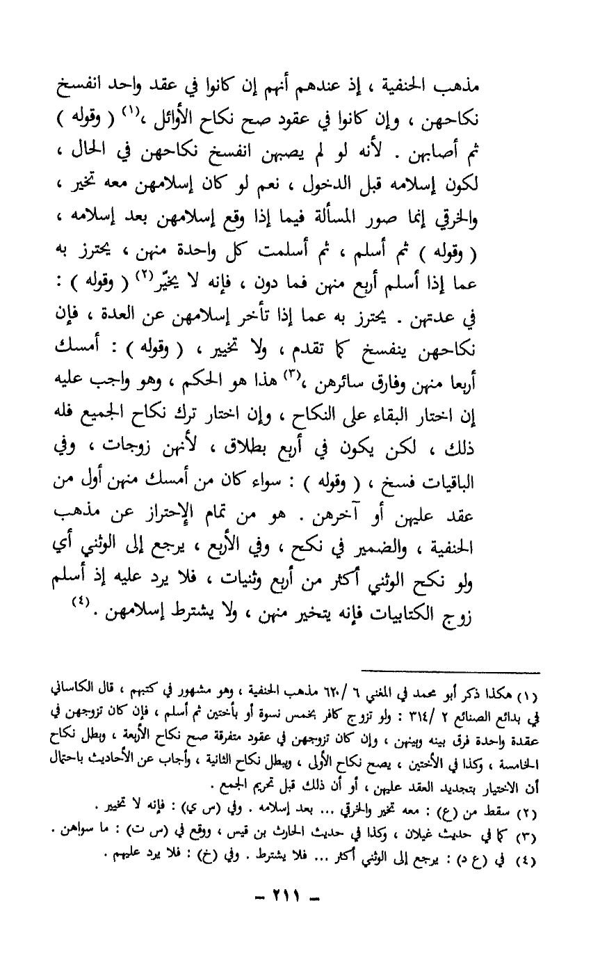 مذهب الحنفية، إذ عندهم أنهم إن كانوا في عقد واحد انفسخ نكاحهن، وإن كانوا في عقود صح نكاح الأوائل، (وقوله) ثم أصابهن. لأنه لو لم يصبهن انفسخ نكاحهن في الحال، لكون إسلامه قبل الدخول، نعم لو كان إسلامهن معه تخير، والخرقي إنما صور المسألة فيما إذا وقع إسلامهن بعد إسلامه، (وقوله) ثم أسلم، ثم أسلمت كل واحدة منهن، يحترز به عما إذا أسلم أربع منهن فما دون، فإنه لا يخير (وقوله) : في عدتهن. يحترز به عما إذا تأخر إسلامهن عن العدة، فإن نكاحهن ينفسخ كما تقدم، ولا تخيير، (وقوله) : أمسك أربعا منهن وفارق سائرهن، هذا هو الحكم، وهو واجب عليه إن اختار البقاء على النكاح، وإن اختار ترك نكاح الجميع فله ذلك، لكن يكون في أربع بطلاق، لأنهن زوجات، وفي الباقيات فسخ، (وقوله) : سواء كان من أمسك منهن أول من عقد عليهن أو آخرهن. هو من تمام الاحتراز عن مذهب الحنفية، والضمير في نكح، وفي الأربع، يرجع إلى الوثني أي ولو نكح الوثني أكثر من أربع وثنيات، فلا يرد عليه إذ أسلم زوج الكتابيات فإنه يتخير منهن، ولا يشترط إسلامهن.