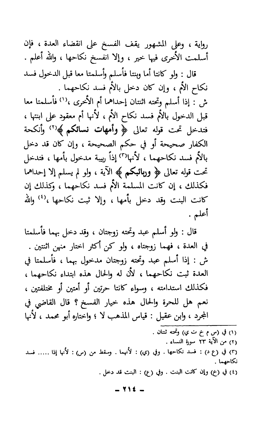 ش: إذا أسلم وتحته اثنتان إحداهما أم الأخرى، فأسلمتا معا قبل الدخول بالأم فسد نكاح الأم، لأنها أم معقود على ابنتها، فتدخل تحت قَوْله تَعَالَى: {وَأُمَّهَاتُ نِسَائِكُمْ} [النساء: 23] وأنكحة الكفار صحيحة أو في حكم الصحيحة، وإن كان قد دخل بالأم فسد نكاحهما، لأنها إذا ربيبة مدخول بأمها، فتدخل تحت قَوْله تَعَالَى: {وَرَبَائِبُكُمُ} [النساء: 23] الآية، ولو لم يسلم إلا إحداهما فكذلك، إن كانت المسلمة الأم فسد نكاحهما، وكذلك إن كانت البنت وقد دخل بأمها، وإلا ثبت نكاحها، والله أعلم.