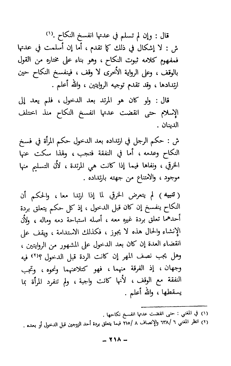 ش: حكم الرجل في ارتداده بعد الدخول حكم المرأة في فسخ النكاح وعدمه، أما في النفقة فتجب، ولهذا سكت عنها الخرقي، ونفاها فيما إذا كانت هي المرتدة، لأن التسليم منها موجود، والامتناع من جهته بارتداده.