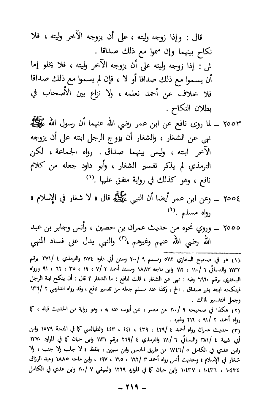 2553 - لما روى نافع عن ابن عمر - رَضِيَ اللَّهُ عَنْهُمَا - «أن رسول الله - صَلَّى اللَّهُ عَلَيْهِ وَسَلَّمَ - نهى عن الشغار، والشغار أن يزوج الرجل ابنته على أن يزوجه الآخر ابنته، وليس بينهما صداق» . رواه الجماعة، لكن الترمذي لم يذكر تفسير الشغار، وأبو داود جعله من كلام نافع، وهو كذلك في رواية متفق عليها.