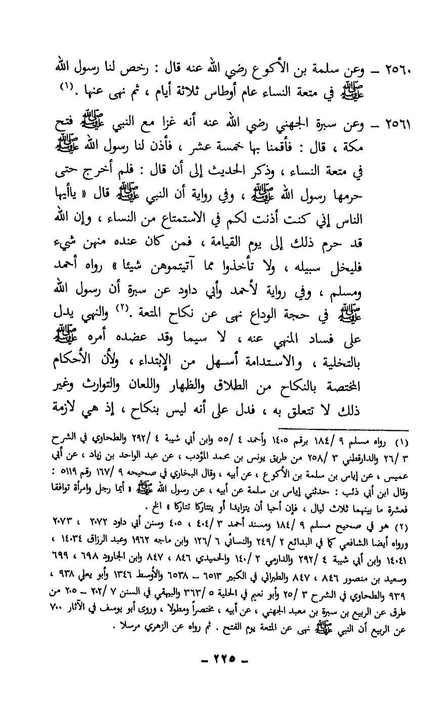 2560 - «وعن سلمة بن الأكوع - رَضِيَ اللَّهُ عَنْهُ - قال: رخص لنا رسول الله - صَلَّى اللَّهُ عَلَيْهِ وَسَلَّمَ - في متعة النساء عام أوطاس ثلاثة أيام، ثم نهى عنها» .