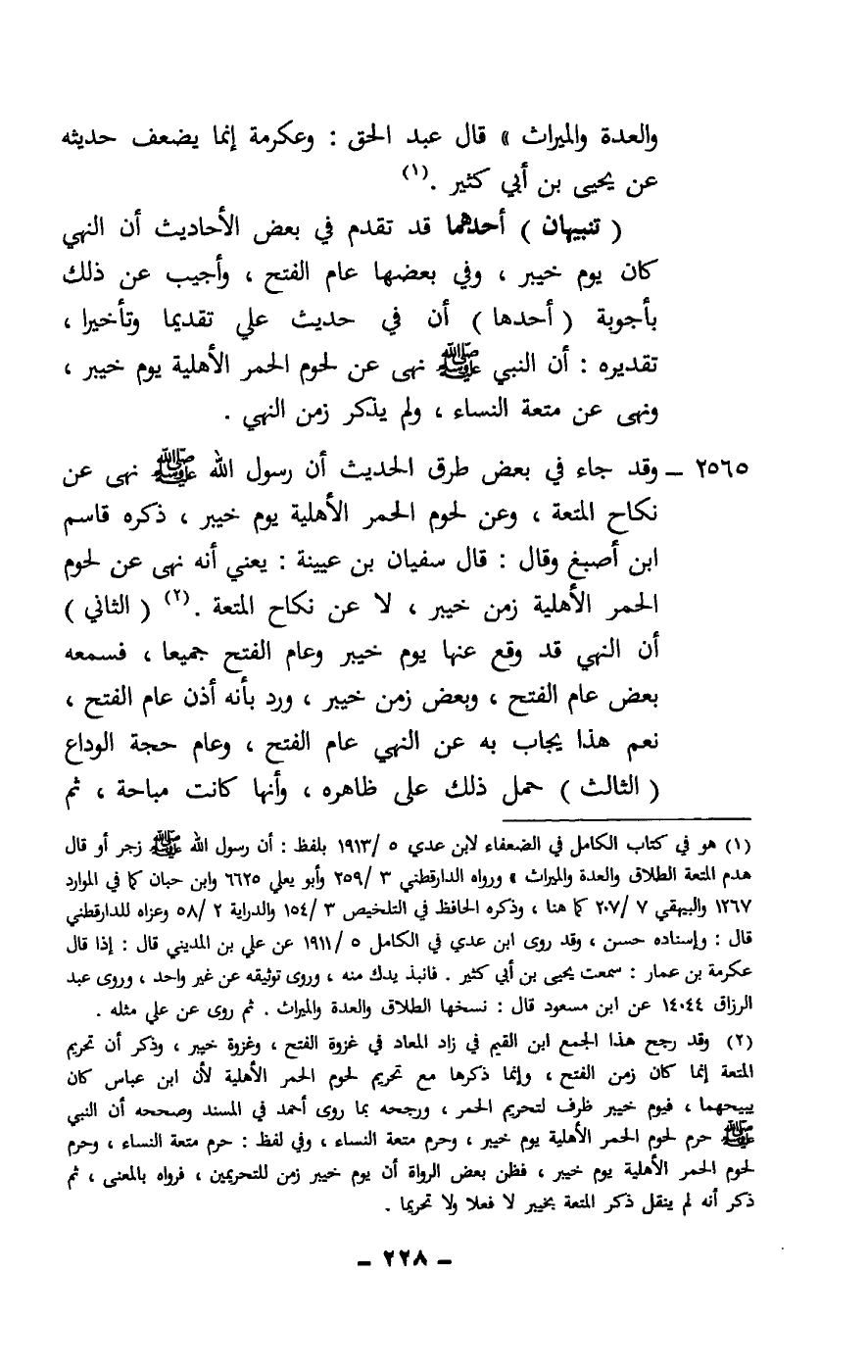 2565 - وقد جاء في بعض طرق الحديث «أن رسول الله - صَلَّى اللَّهُ عَلَيْهِ وَسَلَّمَ - نهى عن نكاح المتعة، وعن لحوم الحمر الأهلية يوم خيبر» ذكره قاسم بن أصبغ وقال: قال سفيان بن عيينة: يعني أنه نهى عن لحوم الحمر الأهلية زمن خيبر، لا عن نكاح المتعة. (الثاني) أن النهي قد وقع عنها يوم خيبر وعام الفتح جميعا، فسمعه بعض عام الفتح، وبعض زمن خيبر، ورد بأنه أذن عام الفتح، نعم هذا يجاب به عن النهي عام الفتح، وعام حجة الوداع (الثالث) حمل ذلك على ظاهره، وأنها كانت مباحة، ثم