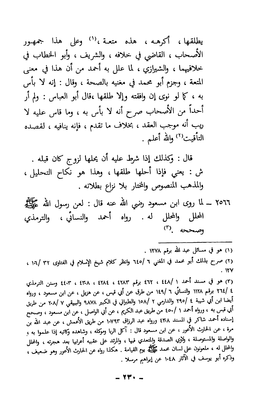 2566 - لما روى ابن مسعود - رَضِيَ اللَّهُ عَنْهُ - قال: «لعن رسول الله - صَلَّى اللَّهُ عَلَيْهِ وَسَلَّمَ - المحلل والمحلل له» . رواه أحمد والنسائي، والترمذي وصححه.