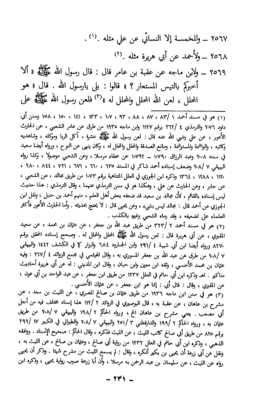 2569 - ولابن ماجه عن عقبة بن عامر قال: قال رسول الله - صَلَّى اللَّهُ عَلَيْهِ وَسَلَّمَ -: «ألا أخبركم بالتيس المستعار؟» قالوا: بلى يا رسول الله. قال: «هو المحلل، لعن الله المحلل والمحلل له» فلعن رسول الله - صَلَّى اللَّهُ عَلَيْهِ وَسَلَّمَ - على