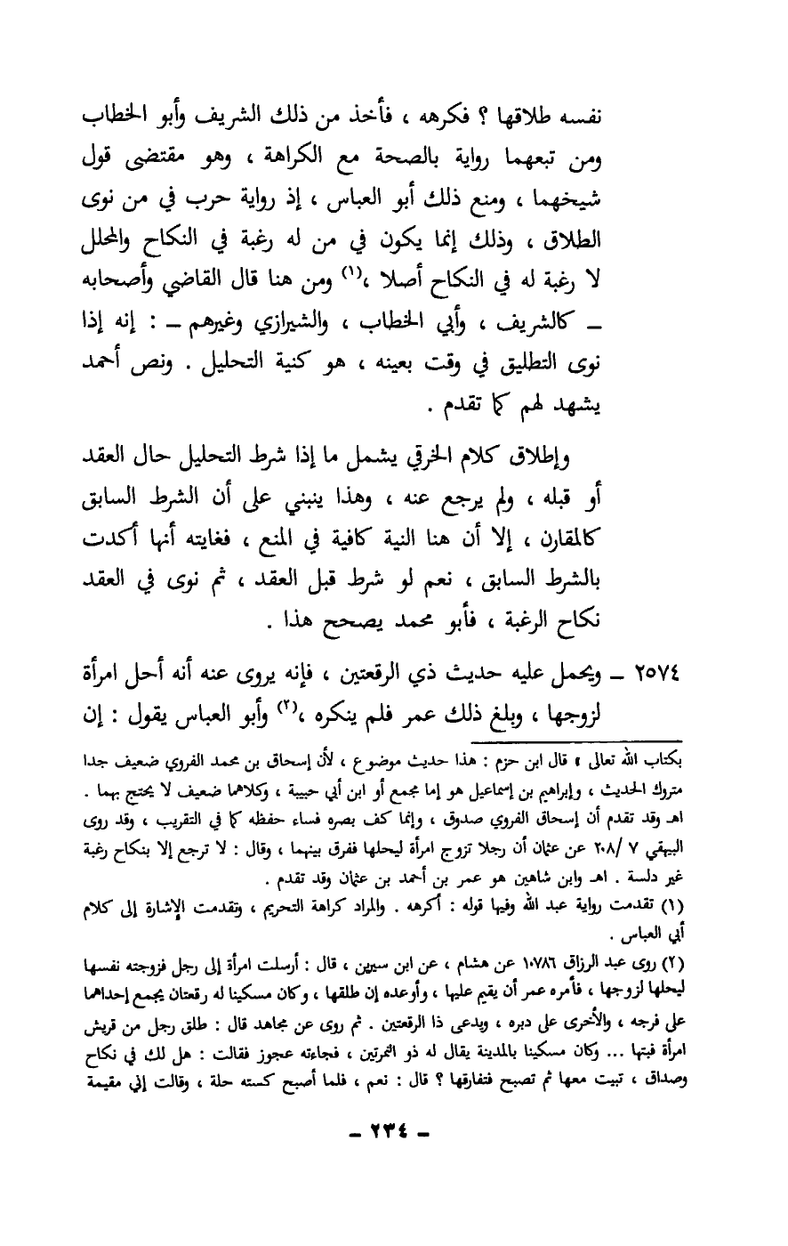 نفسه طلاقها؟ فكرهه، فأخذ من ذلك الشريف وأبو الخطاب ومن تبعهما رواية بالصحة مع الكراهة، وهو مقتضى قول شيخهما، ومنع ذلك أبو العباس، إذ رواية حرب في من نوى الطلاق، وذلك إنما يكون في من له رغبة في النكاح والمحلل لا رغبة له في النكاح أصلا، ومن هنا قال القاضي وأصحابه - كالشريف، وأبي الخطاب، الشيرازي وغيرهم -: إنه إذا نوى التطليق في وقت بعينه، هو كنية التحليل. ونص أحمد يشهد لهم كما تقدم.
