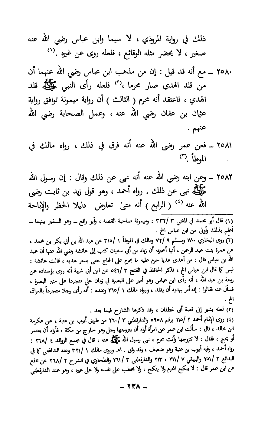 2580 - مع أنه قد قيل: إن من مذهب ابن عباس - رَضِيَ اللَّهُ عَنْهُمَا - أن من قلد الهدي صار محرما، فلعله رأى النبي - صَلَّى اللَّهُ عَلَيْهِ وَسَلَّمَ - قلد الهدي، فاعتقد أنه محرم (الثالث) أن رواية ميمونة توافق رواية عثمان بن عفان - رَضِيَ اللَّهُ عَنْهُ -، وعمل الصحابة - رَضِيَ اللَّهُ عَنْهُمْ -.