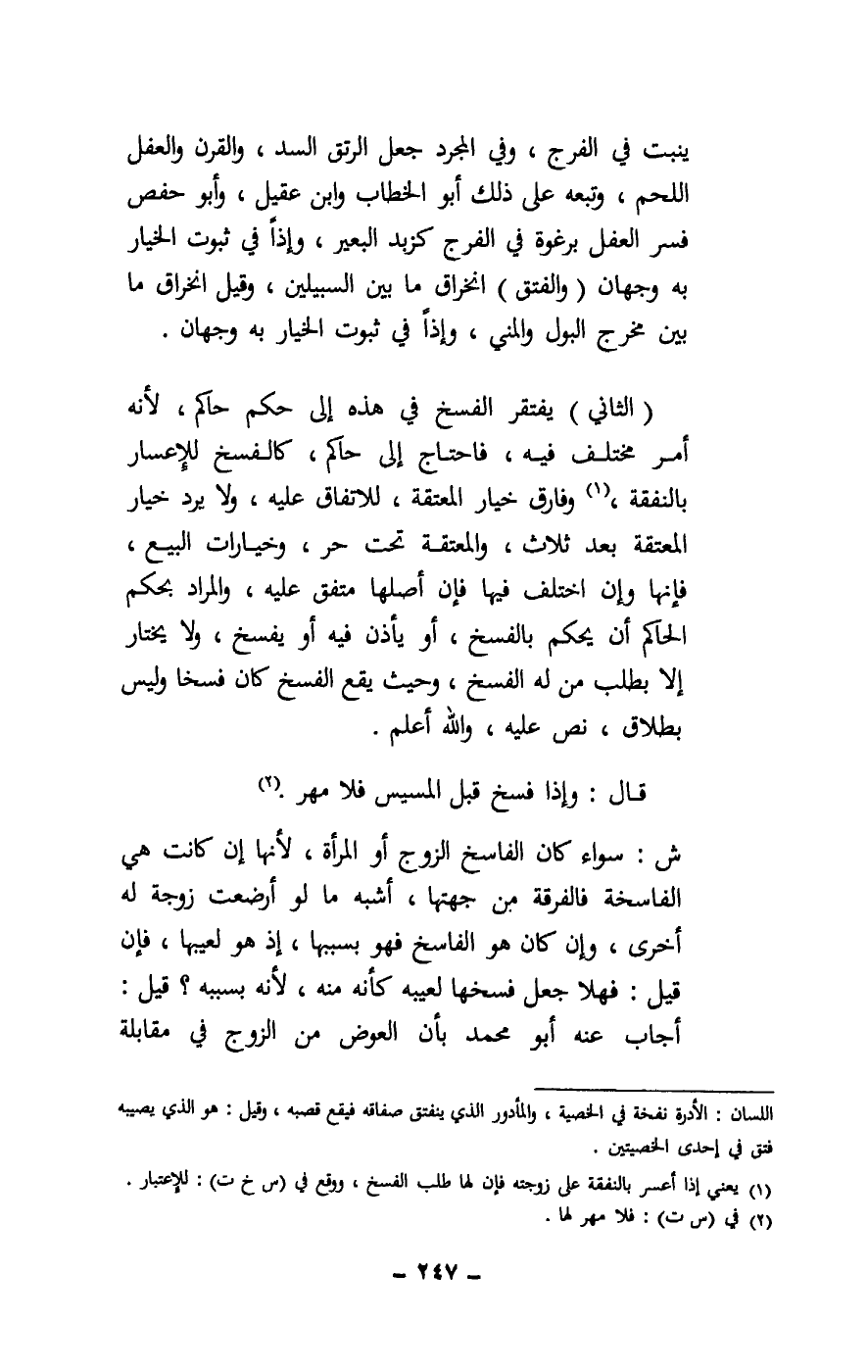(الثاني) يفتقر الفسخ في هذه إلى حكم حاكم، لأنه أمر مختلف فيه، فاحتاج إلى حاكم، كالفسخ للإعسار بالنفقة، وفارق خيار المعتقة، للاتفاق عليه، ولا يرد خيار المعتقة بعد ثلاث، والمعتقة تحت حر، وخيارات البيع، فإنها وإن اختلف فيها فإن أصلها متفق عليه، والمراد بحكم الحاكم أن يحكم بالفسخ، أو يأذن فيه أو يفسخ، ولا يختار إلا بطلب من له الفسخ، وحيث يقع الفسخ كان فسخا وليس بطلاق، نص عليه، والله أعلم.