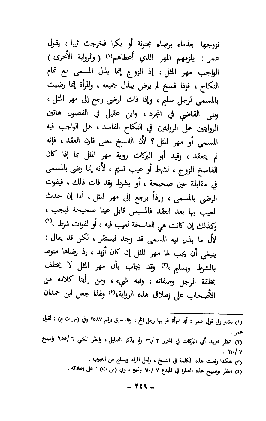 تزوجها جذماء برصاء مجنونة أو بكرا فخرجت ثيبا، يقول عمر: يلزمهم المهر الذي أعطاهم (والرواية الأخرى) الواجب مهر المثل، إذ الزوج إنما بذل المسمى مع تمام النكاح، فإذا فسخ لم يرض ببذل إنما رضيت بالمسمى لرجل سليم، وإذا فات الرضى رجع إلى مهر المثل، وبنى القاضي في المجرد، وابن عقيل في الفصول هاتين الروايتين على الروايتين في النكاح الفاسد، هل الواجب فيه المسمى أو مهر المثل؟ لأن الفسخ لمعنى قارن العقد، فإنه لم ينعقد، وقيد أبو البركات رواية مهر المثل بما إذا كان الفاسخ الزوج، لشرط أو عيب قديم، لأنه إنما رضي بالمسمى في مقابلة عين صحيحة، أو بشرط وقد فات ذلك، فيفوت الرضى بالمسمى، وإذا يرجع إلى مهر المثل، أما إن حدث العيب بها بعد العقد فالمسيس قابل عينا صحيحة فيجب، وكذلك إن كانت هي الفاسخة لعيب فيه، أو لفوات شرط، لأن ما بذل فيه المسمى قد وجد فيستقر، لكن قد يقال: ينبغي أن يجب لها مهر المثل إن كان أزيد، إذ رضاها منوط بالشرط وبسليم، وقد يجاب بأن مهر المثل لا يختلف بخلقة الرجل وصفاته، وفيه شيء، ومن رأينا كلامه من الأصحاب على إطلاق هذه الرواية، ولهذا جعل ابن حمدان