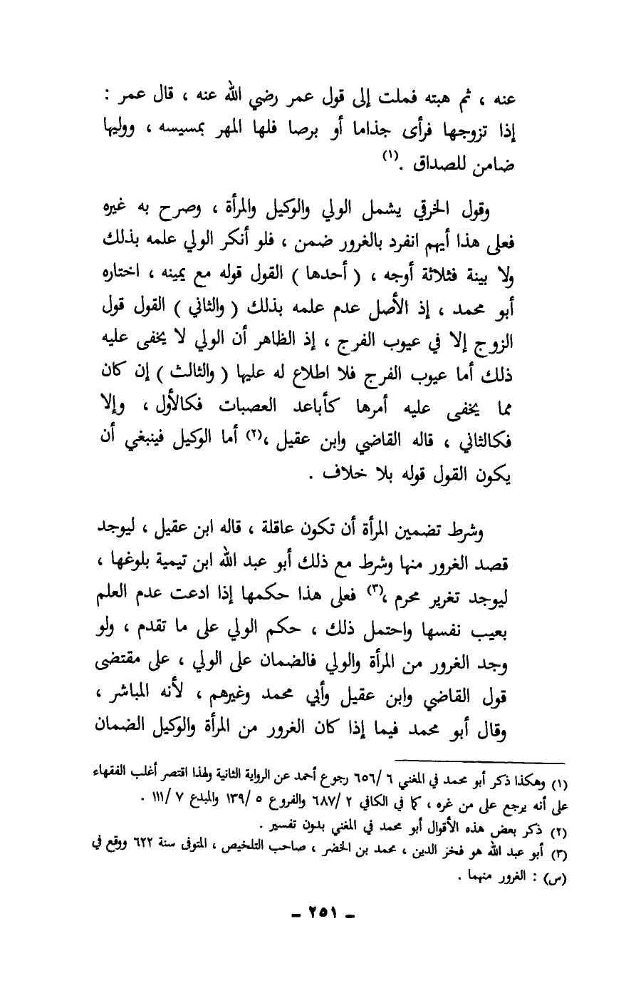 وشرط تضمين المرأة أن تكون عاقلة، قاله ابن عقيل، ليوجد قصد الغرور منها وشرط مع ذلك أبو عبد الله ابن تيمية بلوغها، ليوجد تغرير محرم، فعلى هذا حكمها إذا ادعت عدم العلم بعيب نفسها واحتمل ذلك، حكم الولي على ما تقدم، ولو وجد الغرور من المرأة والولي فالضمان على الولي، على مقتضى قول القاضي وابن عقيل وأبي محمد وغيرهم، لأنه المباشر، وقال أبو محمد فيما إذا كان الغرور من المرأة والوكيل الضمان