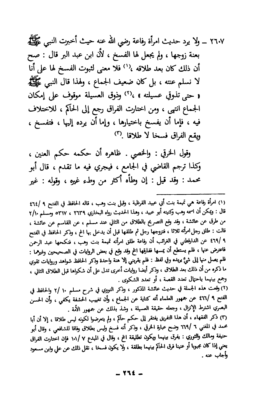 2607 - ولا يرد حديث امرأة رفاعة - رَضِيَ اللَّهُ عَنْهُ - حيث أخبرت النبي - صَلَّى اللَّهُ عَلَيْهِ وَسَلَّمَ - بعنة زوجها، ولم يجعل لها الفسخ، لأن ابن عبد البر قال: صح أن ذلك كان بعد طلاقه، فلا معنى لثبوت الفسخ لها على أنا لا نسلم عنته، بل كان ضعيف الجماع، ولهذا قال النبي - صَلَّى اللَّهُ عَلَيْهِ وَسَلَّمَ -: «حتى تذوقي عسيلته» ، وذوق العسيلة موقوف على إمكان الجماع، انتهى، ومن اختارت الفراق رجع إلى الحاكم، للاختلاف فيه، فإما أن يفسخ باختيارها، وإما أن يرده إليها، فتفسخ، ويقع الفراق فسخا لا طلاقا.