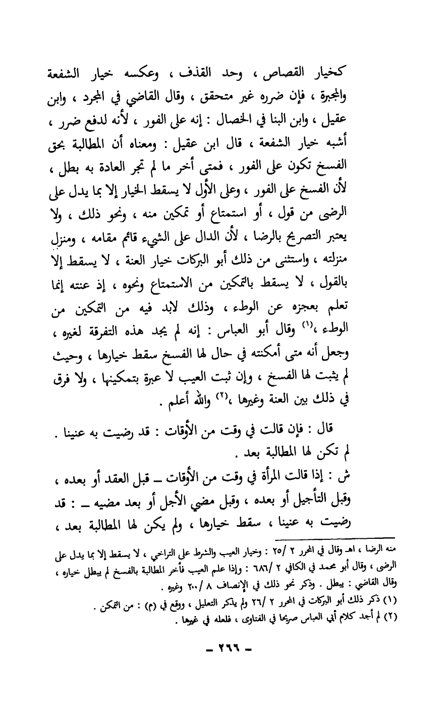 كخيار القصاص، وحد القذف، وعكسه خيار الشفعة والمجبرة، فإن ضرره غير متحقق، وقال القاضي في المجرد، وابن عقيل، وابن البنا في الخصال: إنه على الفور، لأنه لدفع ضرر، أشبه خيار الشفعة، قال ابن عقيل: ومعناه أن المطالبة بحق الفسخ تكون على الفور، فمتى أخر ما لم تجر العادة به بطل، لأن الفسخ على الفور، وعلى الأول لا يسقط الخيار إلا بما يدل على الرضى من قول، أو استمتاع أو تمكين منه، ونحو ذلك، ولا يعتبر التصريح بالرضا، لأن الدال على الشيء قائم مقامه، ومنزل منزلته، واستثنى من ذلك أبو البركات خيار العنة، لا يسقط إلا بالقول، لا يسقط بالتمكين من الاستمتاع ونحوه، إذ عنته إنما تعلم بعجزه عن الوطء، وذلك لا بد فيه من التمكين من الوطء، وقال أبو العباس: إنه لم يجد هذه التفرقة لغيره، وجعل أنه متى أمكنته في حال لها الفسخ سقط خيارها، وحيث لم يثبت لها الفسخ، وإن ثبت العيب لا عبرة بتمكينها، ولا فرق في ذلك بين العنة وغيرها، والله أعلم.