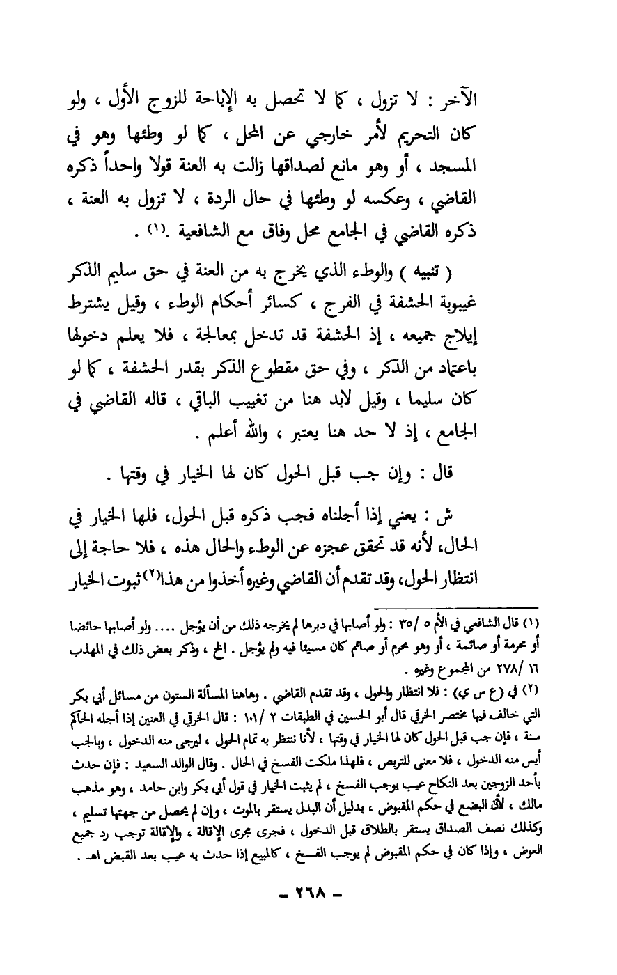 (تنبيه) والوطء الذي يخرج به من العنة في حق سليم الذكر غيبوبة الحشفة في الفرج، كسائر أحكام الوطء، وقيل يشترط إيلاج جميعه، إذ الحشفة قد تدخل بمعالجة، فلا يعلم دخولها باعتماد من الذكر، وفي حق مقطوع الذكر بقدر الحشفة، كما لو كان سليما، وقيل لا بد هنا من تغييب الباقي، قاله القاضي في الجامع، إذ لا حد هنا يعتبر، والله أعلم.