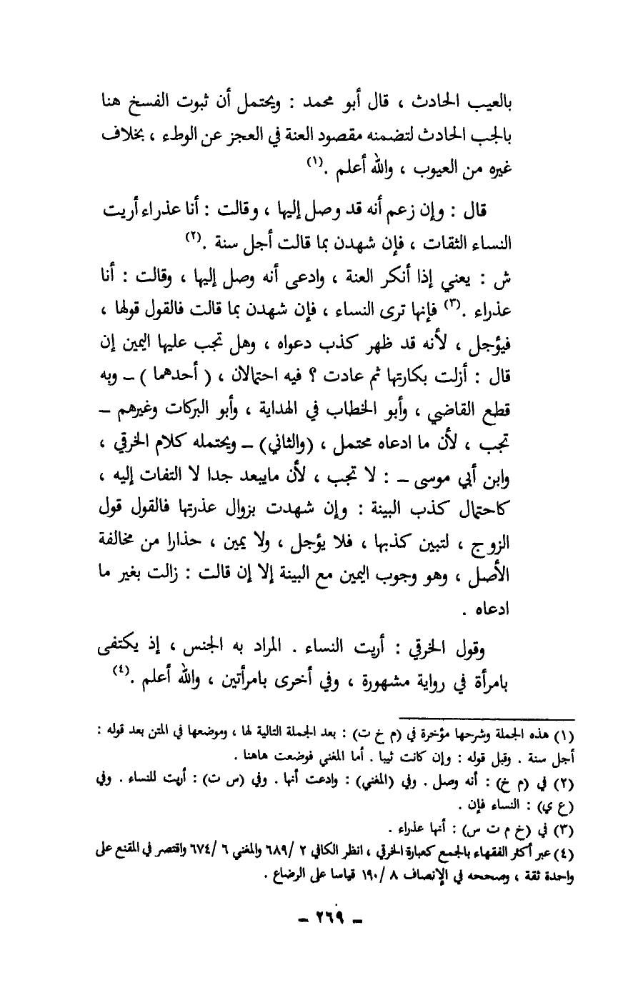 ش: يعني إذا أنكر العنة، وادعى أنه وصل إليها، وقالت: أنا عذراء. فإنها ترى النساء، فإن شهدن بما قالت فالقول قولها، فيؤجل، لأنه قد ظهر كذب دعواه، وهل تجب عليها اليمين إن قال: أزلت بكارتها ثم عادت؟ فيه احتمالان، (أحدهما) - وبه قطع القاضي، وأبو الخطاب في الهداية، وأبو البركات وغيرهم - تجب، لأن ما ادعاه محتمل، (والثاني) - ويحتمله كلام الخرقي، وابن أبي موسى -: لا تجب، لأن ما يبعد جدا لا التفات إليه كاحتمال كذب البينة، وإن شهدت بزوال عذرتها فالقول قول الزوج، لتبين كذبها، فلا يؤجل، ولا يمين، حذارا من مخالفة الأصل، وهو وجوب اليمين مع البينة إلا إن قالت: زالت بغير ما ادعاه.
