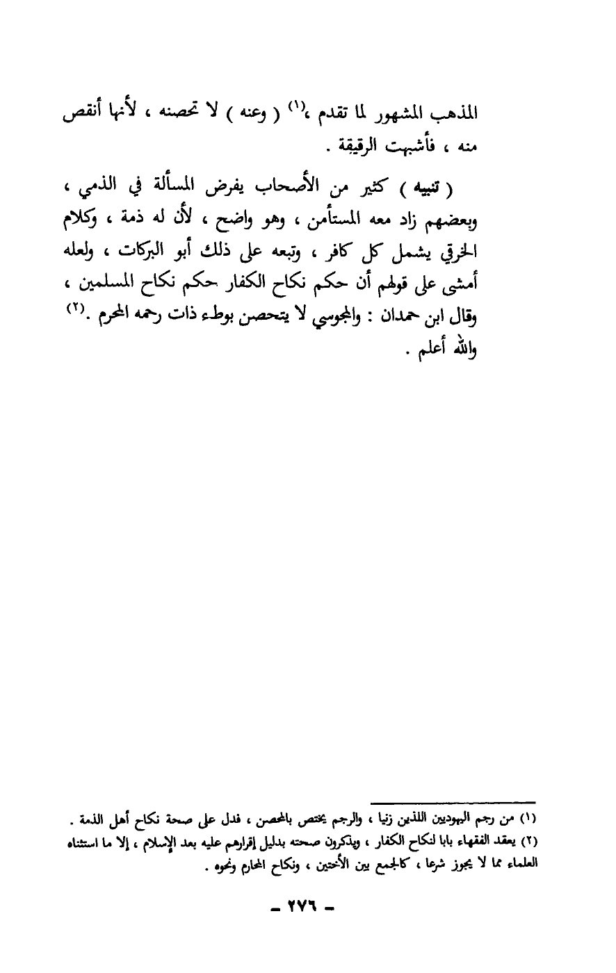 (تنبيه) كثير من الأصحاب يفرض المسألة في الذمي، وبعضهم زاد معه المستأمن، وهو واضح، لأن له ذمة، وكلام الخرقي يشمل كل كافر، وتبعه على ذلك أبو البركات، ولعله أمشى على قولهم أن حكم نكاح الكفار حكم نكاح المسلمين، وقال ابن حمدان: والمجوسي لا يتحصن بوطء ذات رحمه المحرم. والله أعلم.