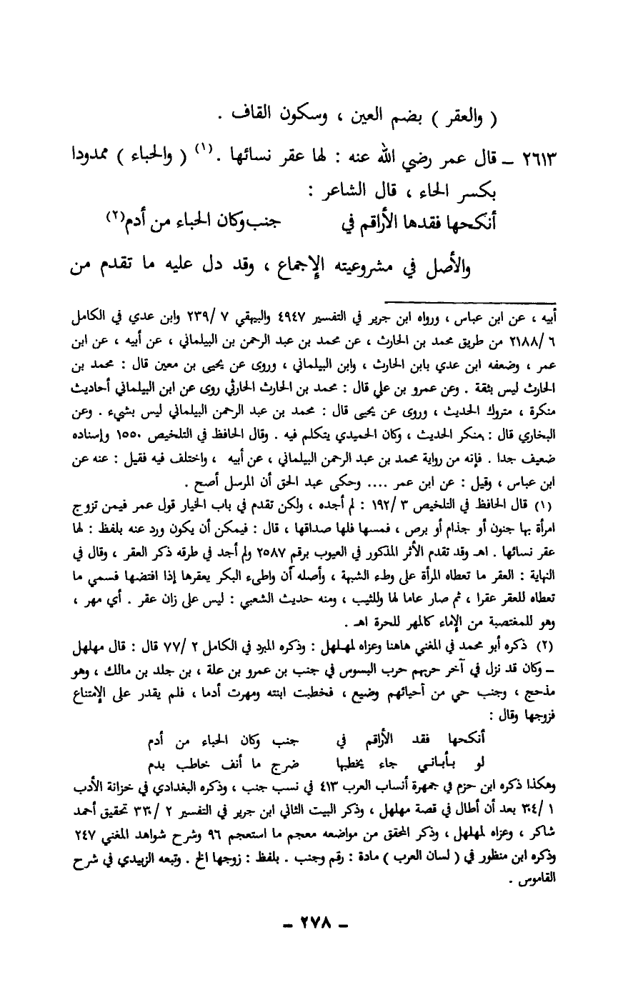 2613 - قال عمر - رَضِيَ اللَّهُ عَنْهُ -: لها عقر نسائها. (والحباء) ممدودا بكسر الحاء، قال الشاعر: