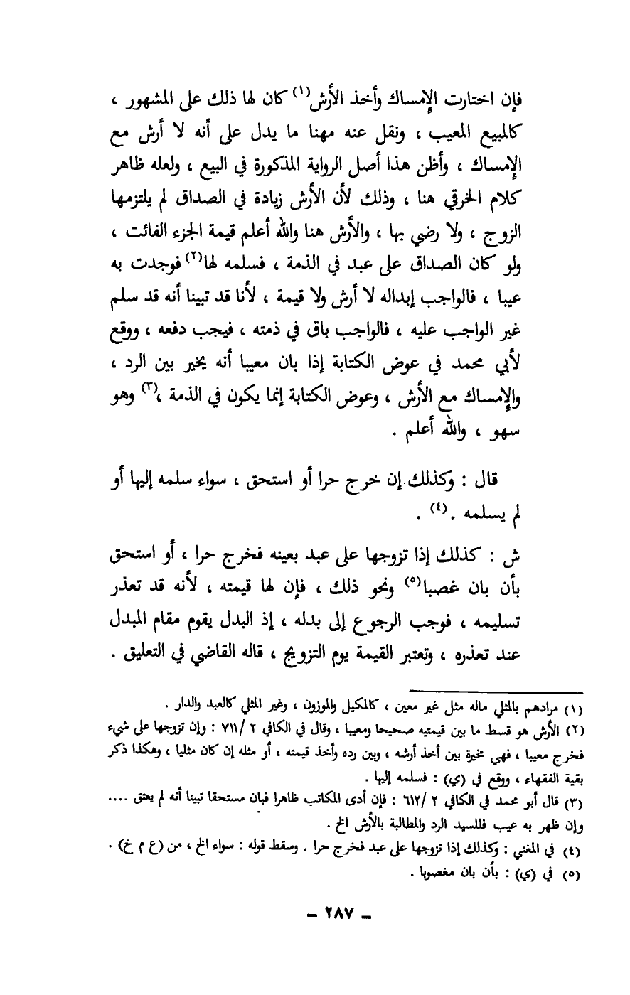 فإن اختارت الإمساك وأخذ الأرش كان لها ذلك على المشهور، كالمبيع المعيب، ونقل عنه مهنا ما يدل على أنه لا أرش مع الإمساك، وأظن هذا أصل الرواية المذكورة في البيع، ولعله ظاهر كلام الخرقي هنا، وذلك لأن الأرش زيادة في الصداق لم يلتزمها الزوج، ولا رضي بها، والأرش هنا والله أعلم قيمة الجزء الفائت، ولو كان الصداق على عبد في الذمة، فسلمه لها فوجدت به عيبا، فالواجب إبداله لا أرش ولا قيمة، لأنا قد تبينا أنه قد سلم غير الواجب عليه، فالواجب باق في ذمته، فيجب دفعه، ووقع لأبي محمد في عوض الكتابة إذا بان معيبا أنه يخير بين الرد، والإمساك مع الأرش، وعوض الكتابة إنما يكون في الذمة، وهو سهو، والله أعلم.