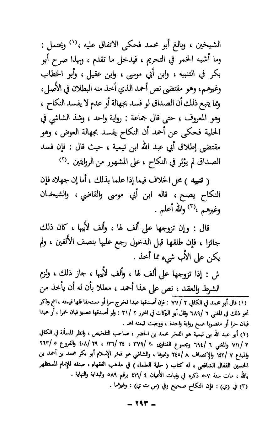 الشيخين، وبالغ أبو محمد فحكى الاتفاق عليه، ويحتمل: وما أشبه الخمر في التحريم، فيدخل ما تقدم، وبهذا صرح أبو بكر في التنبيه، وابن أبي موسى، وابن عقيل، وأبو الخطاب وغيرهم، وهو مقتضى نص أحمد الذي أخذ منه البطلان في الأصل، ومما يتبع أن الصداق لو فسد بجهالة أو عدم لا يفسد النكاح، وهو المعروف، حتى قال جماعة: رواية واحد، وشذ الشاشي في الحلية فحكى عن أحمد أن النكاح يفسد بجهالة العوض، وهو مقتضى إطلاق أبي عبد الله ابن تيمية، حيث قال: فإن فسد الصداق لم يؤثر في النكاح، على المشهور من الروايتين.