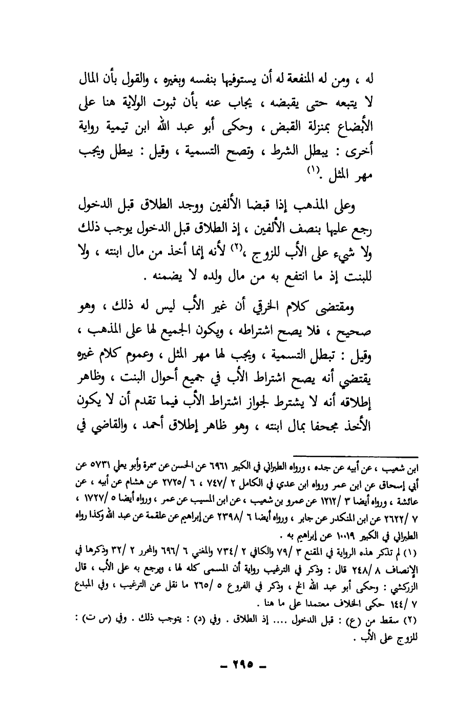 ومقتضى كلام الخرقي أن غير الأب ليس له ذلك، وهو صحيح، فلا يصح اشتراطه، ويكون الجميع لها على المذهب، وقيل: تبطل التسمية، ويجب لها مهر المثل، وعموم كلام غيره يقتضي أنه يصح اشتراط الأب في جميع أحوال البنت، وظاهر إطلاقه أنه لا يشترط لجواز اشتراط الأب فيما تقدم أن لا يكون الأخذ مجحفا بمال ابنته، وهو ظاهر إطلاق أحمد، والقاضي في