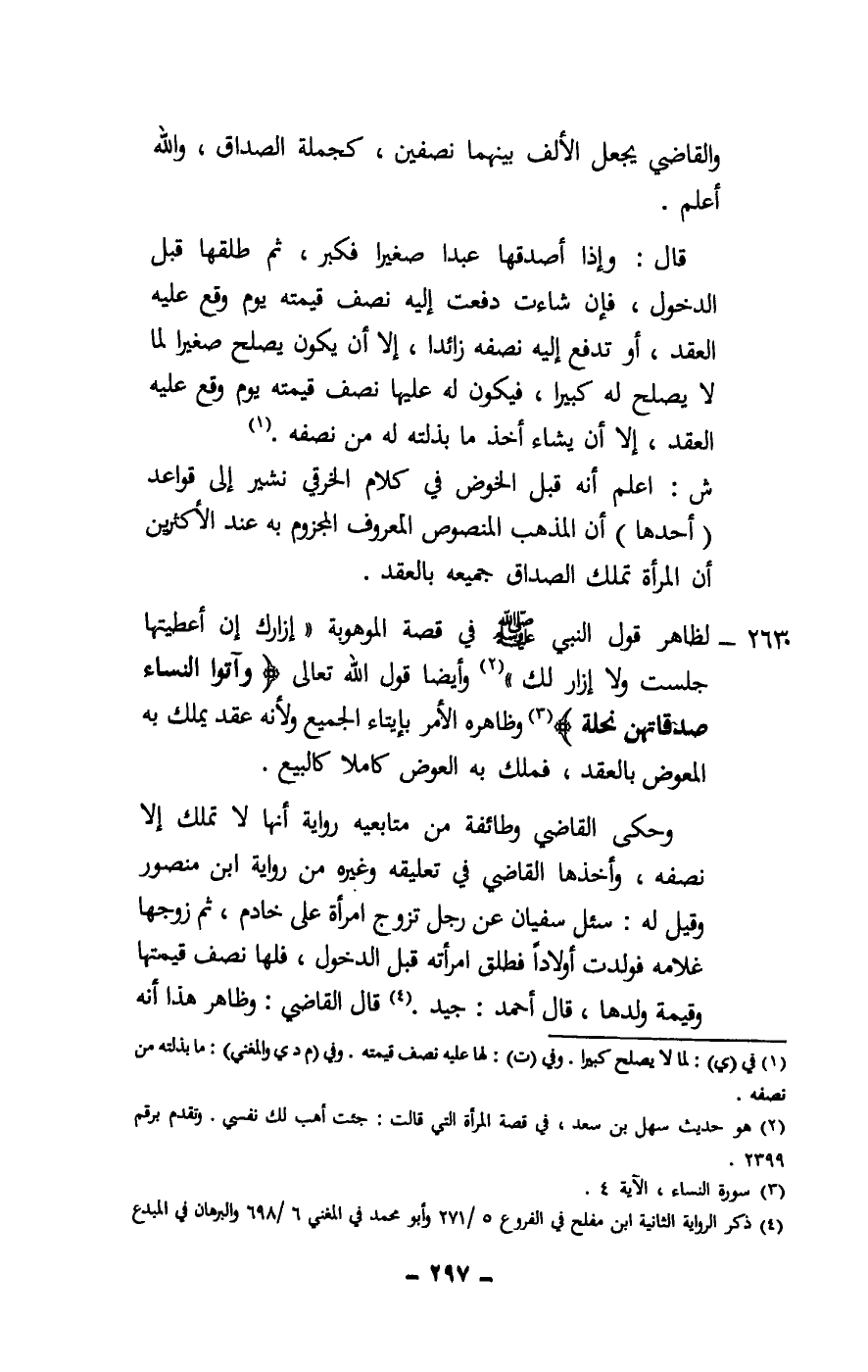 2630 - لظاهر قول النبي - صَلَّى اللَّهُ عَلَيْهِ وَسَلَّمَ - في قصة الموهوبة: «إزارك إن أعطيتها جلست ولا إزار لك» وأيضا قول الله تعالى: {وَآتُوا النِّسَاءَ صَدُقَاتِهِنَّ نِحْلَةً} [النساء: 4] وظاهره الأمر بإيتاء الجميع ولأنه عقد يملك به المعوض بالعقد، فملك به العوض كاملا كالبيع.