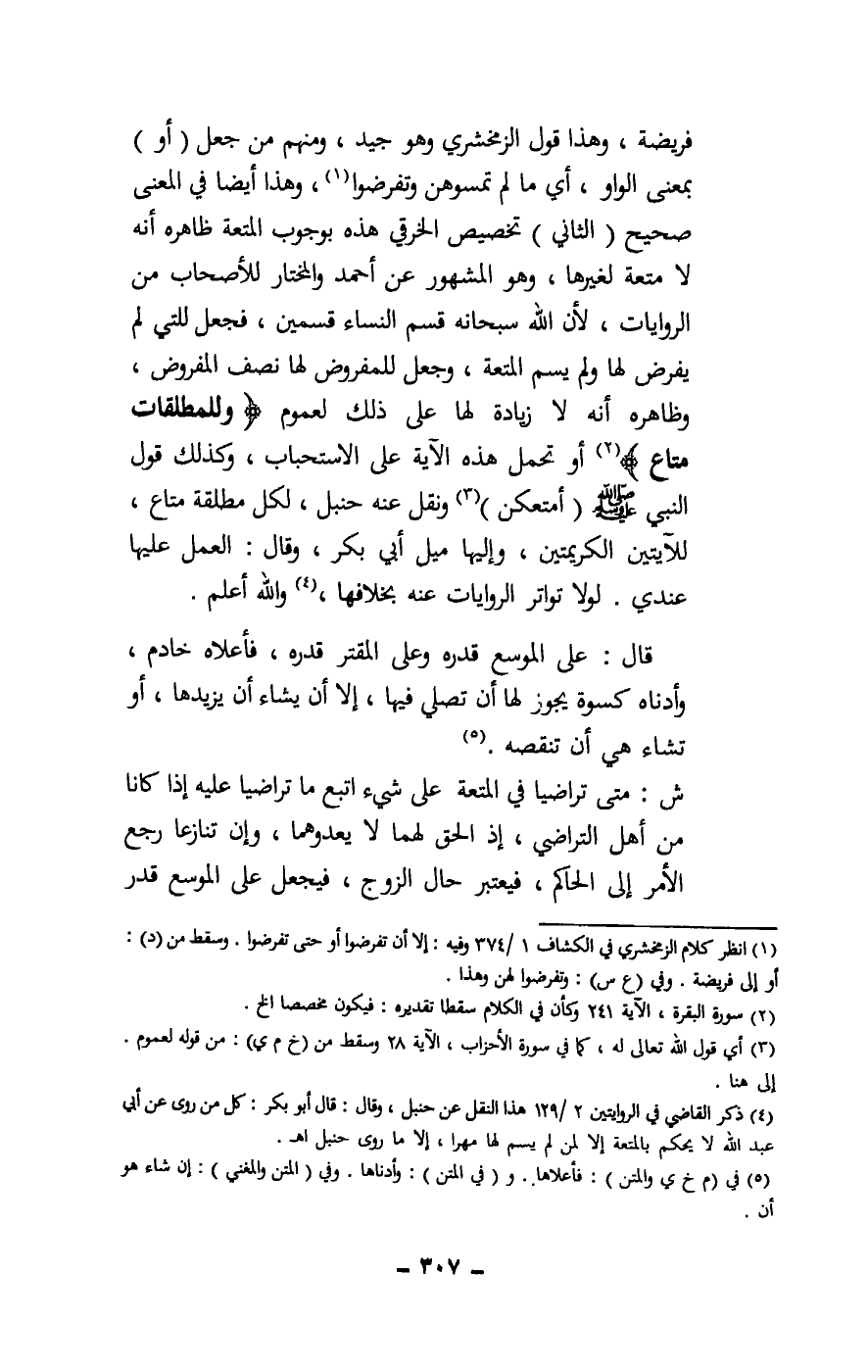 فريضة، وهذا قول الزمخشري وهو جيد، ومنهم من جعل (أو) بمعنى الواو، أي ما لم تمسوهن وتفرضوا، وهذا أيضا في المعنى صحيح. (الثاني) تخصيص الخرقي هذه بوجوب المتعة ظاهره أنه لا متعة لغيرها، وهو المشهور عن أحمد والمختار للأصحاب من الروايات، لأن الله سبحانه قسم النساء قسمين، فجعل للتي لم يفرض لها ولم يسم المتعة، وجعل للمفروض لها نصف المفروض، وظاهره أنه لا زيادة لها على ذلك لعموم {وَلِلْمُطَلَّقَاتِ مَتَاعٌ} [البقرة: 241] أو تحمل هذه الآية على الاستحباب، وكذلك قول النبي - صَلَّى اللَّهُ عَلَيْهِ وَسَلَّمَ -: (أمتعكن) ونقل عنه حنبل، لكل مطلقة متاع، للآيتين الكريمتين، وإليها ميل أبي بكر، وقال: العمل عليها عندي. لولا تواتر الروايات عنه بخلافها، والله أعلم.