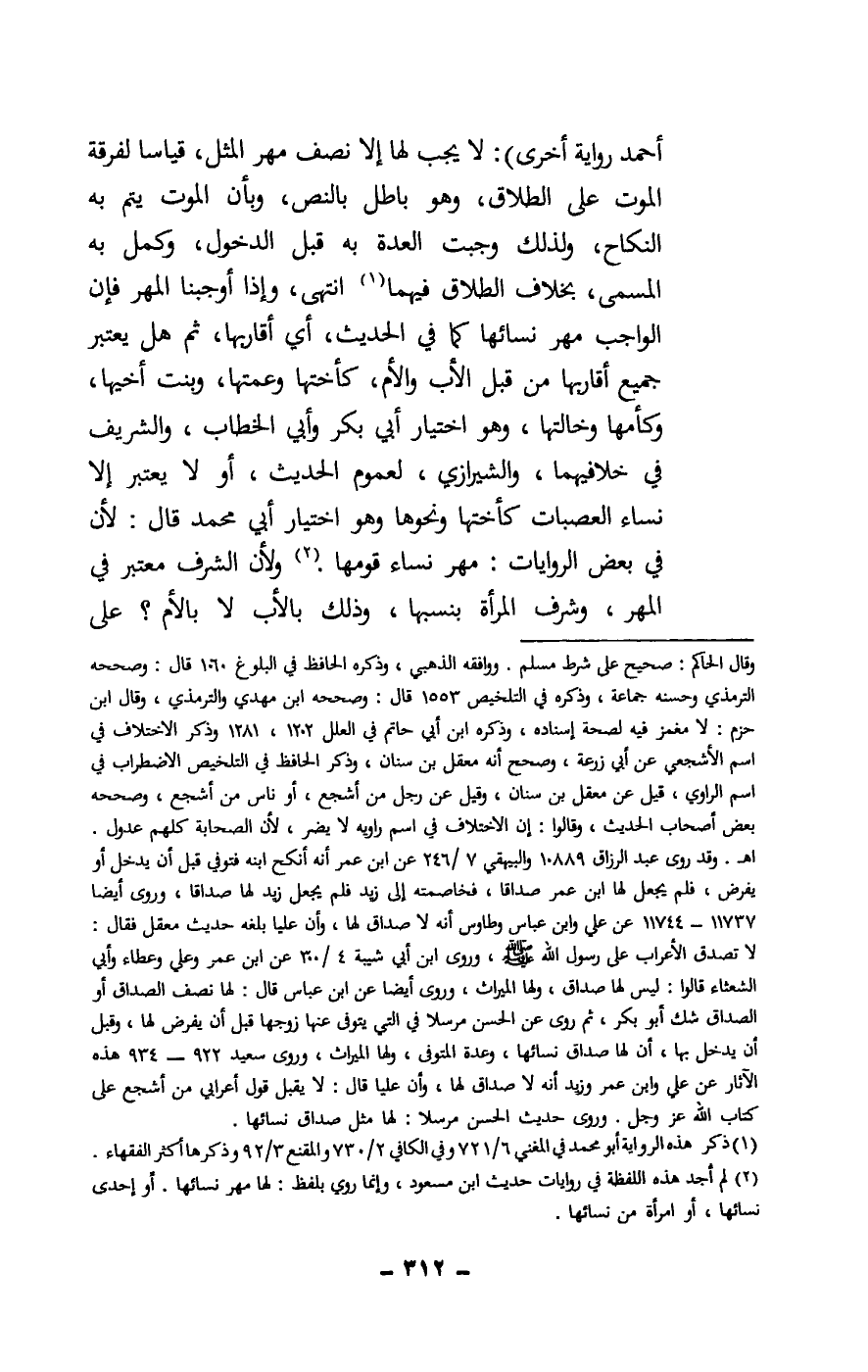 أحمد رواية أخرى) : لا يجب لها إلا نصف مهر المثل، قياسا لفرقة الموت على الطلاق، وهو باطل بالنص، وبأن الموت يتم به النكاح، ولذلك وجبت العدة به قبل الدخول، وكمل به المسمى، بخلاف الطلاق فيهما، انتهى، وإذا أوجبنا المهر فإن الواجب مهر نسائها كما في الحديث، أي أقاربها، ثم هل يعتبر جميع أقاربها من قبل الأب والأم، كأختها وعمتها، وبنت أخيها، وكأمها وخالتها، وهو اختيار أبي بكر وأبي الخطاب، والشريف في خلافيهما، والشيرازي، لعموم الحديث، أو لا يعتبر إلا نساء العصبات كأختها ونحوها وهو اختيار أبي محمد قال: لأن في بعض الروايات: مهر نساء قومها، ولأن الشرف معتبر في المهر، وشرف المرأة بنسبها، وذلك بالأب لا بالأم؟ على