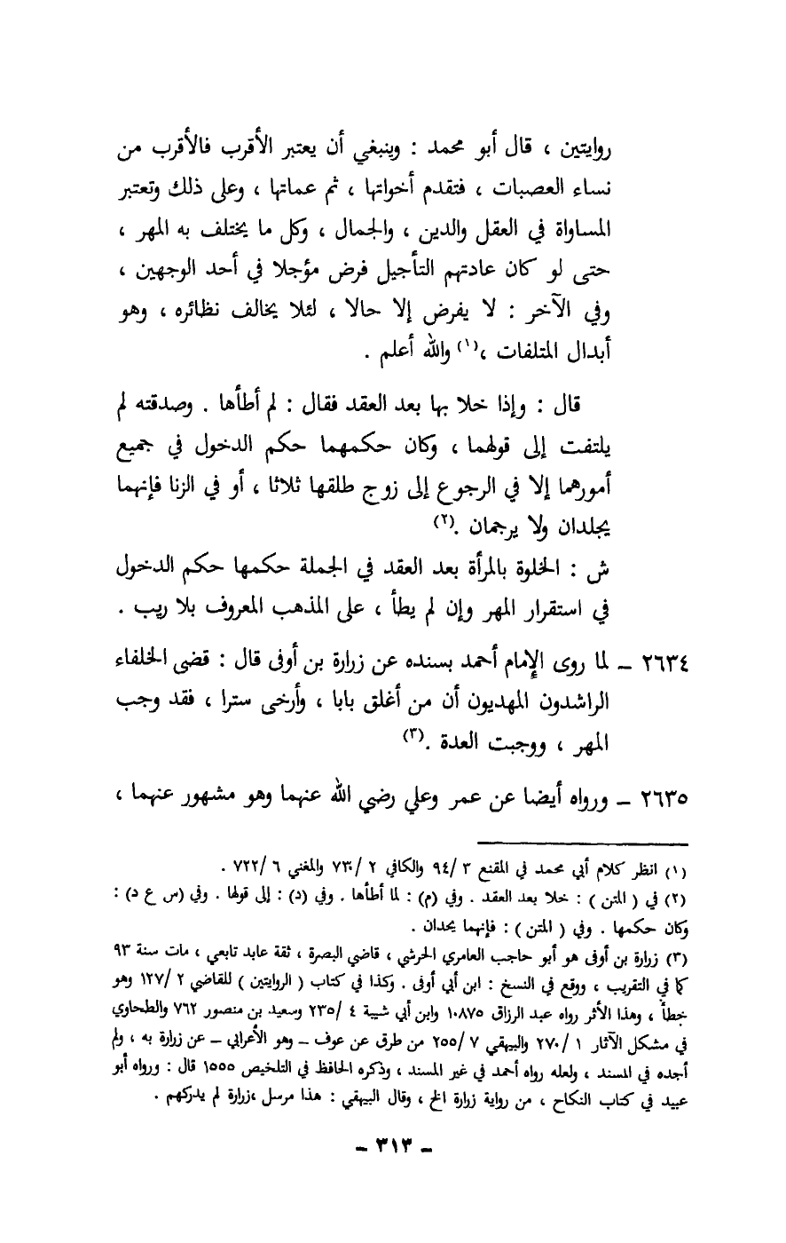 2634 - لما روى الإمام أحمد بسنده عن زرارة بن أوفى قال: قضى الخلفاء الراشدون المهديون أن من أغلق بابا، وأرخى سترا، فقد وجب المهر، ووجبت العدة.