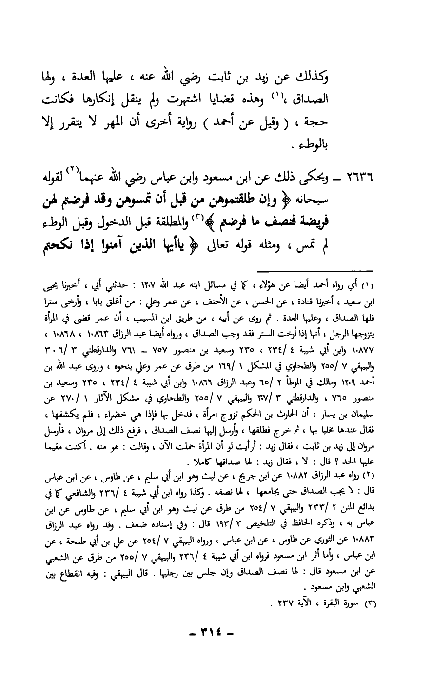 2636 - ويحكى ذلك عن ابن مسعود وابن عباس - رَضِيَ اللَّهُ عَنْهُمَا - لقوله سبحانه: {وَإِنْ طَلَّقْتُمُوهُنَّ مِنْ قَبْلِ أَنْ تَمَسُّوهُنَّ وَقَدْ فَرَضْتُمْ لَهُنَّ فَرِيضَةً فَنِصْفُ مَا فَرَضْتُمْ} [البقرة: 237] والمطلقة قبل الدخول وقبل الوطء لم تمس، ومثله قَوْله تَعَالَى: {يَاأَيُّهَا الَّذِينَ آمَنُوا إِذَا نَكَحْتُمُ الْمُؤْمِنَاتِ ثُمَّ طَلَّقْتُمُوهُنَّ مِنْ قَبْلِ أَنْ تَمَسُّوهُنَّ فَمَا لَكُمْ عَلَيْهِنَّ مِنْ عِدَّةٍ تَعْتَدُّونَهَا} [الأحزاب: 49]