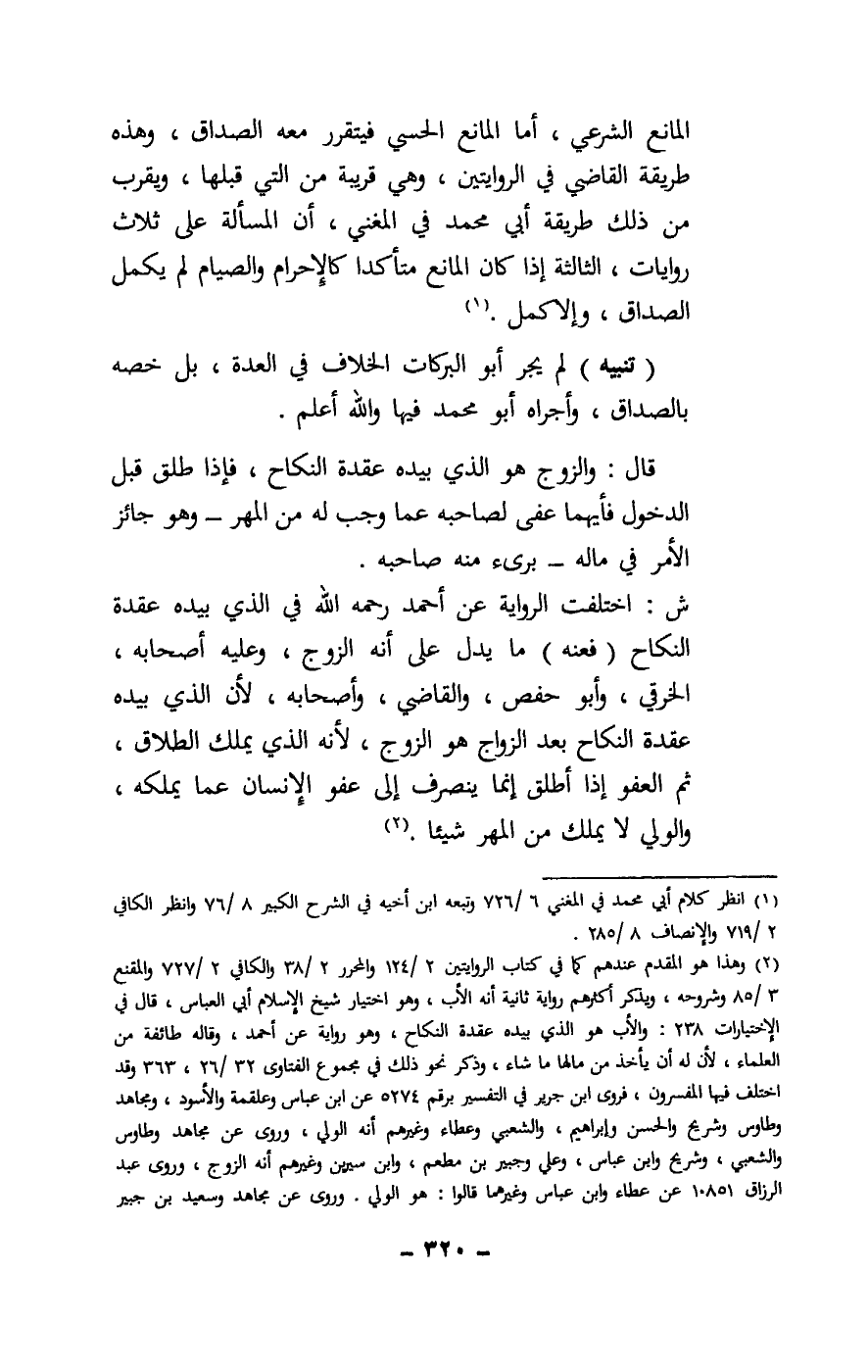 ش: اختلفت الرواية عن أحمد - رَحِمَهُ اللَّهُ - في الذي بيده عقدة النكاح (فعنه) ما يدل على أنه الزوج، وعليه أصحابه، الخرقي، وأبو حفص، والقاضي، وأصحابه، لأن الذي بيده عقدة النكاح بعد الزواج هو الزوج، لأنه الذي يملك الطلاق، ثم العفو إذا أطلق إنما ينصرف إلى عفو الإنسان عما يملكه، والولي لا يملك من المهر شيئا.