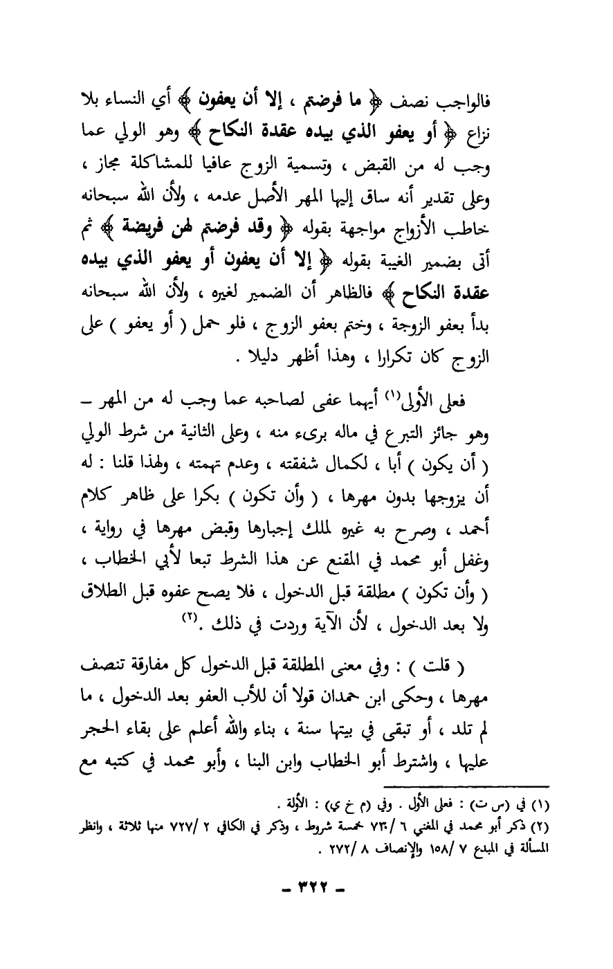 فالواجب نصف {مَا فَرَضْتُمْ إِلَّا أَنْ يَعْفُونَ} [البقرة: 237] أي النساء بلا نزاع {أَوْ يَعْفُوَ الَّذِي بِيَدِهِ عُقْدَةُ النِّكَاحِ} [البقرة: 237] وهو الولي عما وجب له من القبض، وتسمية الزوج عافيا للمشاكلة مجاز، وعلى تقدير أنه ساق إليها المهر الأصل عدمه، ولأن الله سبحانه خاطب الأزواج مواجهة بقوله: {وَقَدْ فَرَضْتُمْ لَهُنَّ فَرِيضَةً} [البقرة: 237] ثم أتى بضمير الغيبة بقوله: {إِلَّا أَنْ يَعْفُونَ أَوْ يَعْفُوَ الَّذِي بِيَدِهِ عُقْدَةُ النِّكَاحِ} [البقرة: 237] فالظاهر أن الضمير لغيره، ولأن الله سبحانه بدأ بعفو الزوجة، وختم بعفو الزوج، فلو حمل (أو يعفو) على الزوج كان تكرارا، وهذا أظهر دليلا.