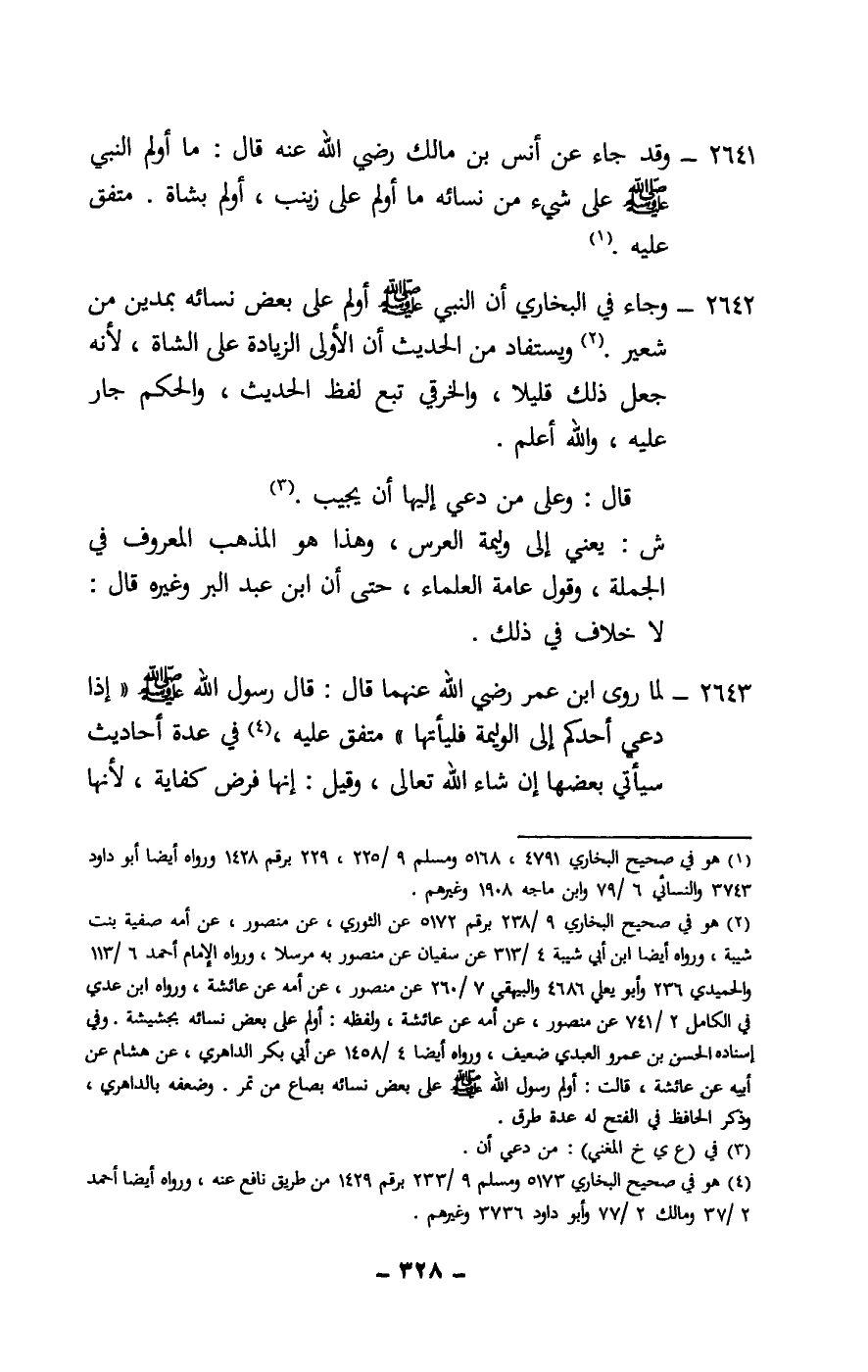 2641 - وقد جاء عن أنس بن مالك - رَضِيَ اللَّهُ عَنْهُ - قال: «ما أولم النبي - صَلَّى اللَّهُ عَلَيْهِ وَسَلَّمَ - على شيء من نسائه ما أولم على زينب، أولم بشاة» . متفق عليه.