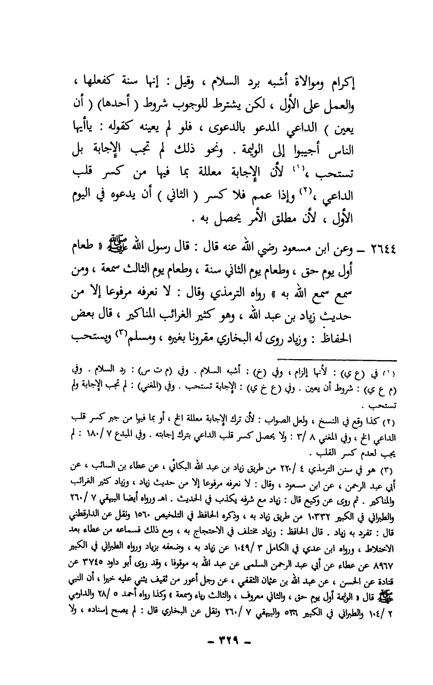 2644 - وعن ابن مسعود - رَضِيَ اللَّهُ عَنْهُ - قال: قال رسول الله - صَلَّى اللَّهُ عَلَيْهِ وَسَلَّمَ -: «طعام أول يوم حق، وطعام يوم الثاني سنة، وطعام يوم الثالث سمعة، ومن سمع سمع الله به» رواه الترمذي وقال: لا نعرفه مرفوعا إلا من حديث زياد بن عبد الله، وهو كثير الغرائب المناكير، قال بعض الحفاظ: وزياد روى له البخاري مقرونا بغيره، ومسلم ويستحب