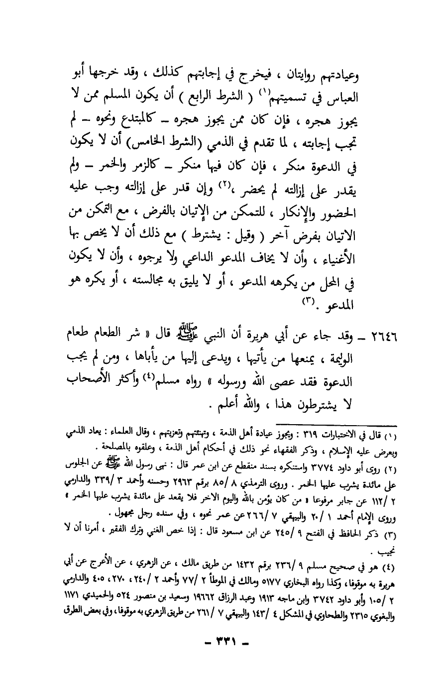 2646 - وقد جاء عن أبي هريرة أن النبي - صَلَّى اللَّهُ عَلَيْهِ وَسَلَّمَ - قال: «شر الطعام طعام الوليمة، يمنعها من يأتيها، ويدعى إليها من يأباها، ومن لم يجب الدعوة فقد عصى الله ورسوله» رواه مسلم وأكثر الأصحاب لا يشترطون هذا، والله أعلم.