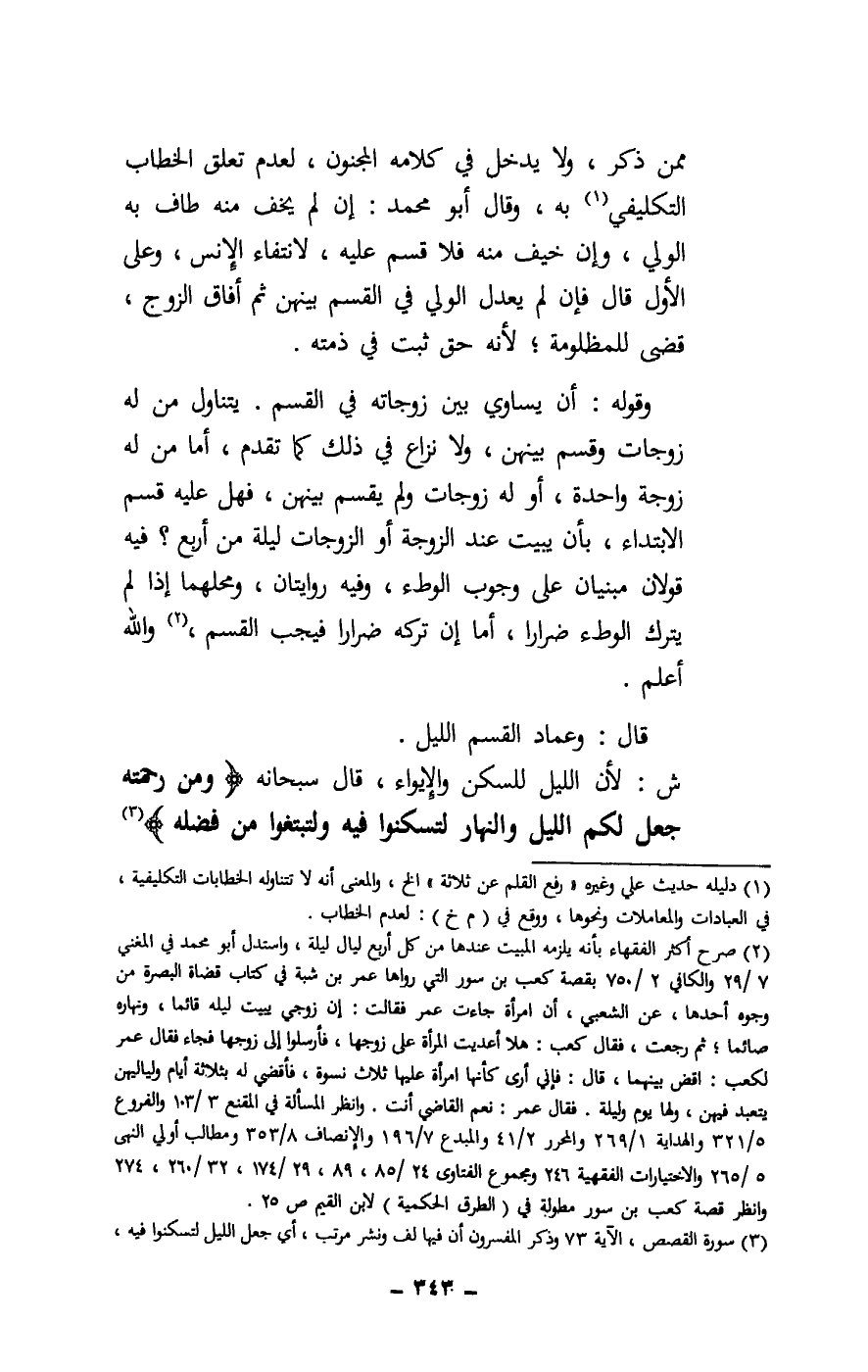 ممن ذكر، ولا يدخل في كلامه المجنون، لعدم تعلق الخطاب التكليفي به، وقال أبو محمد: إن لم يخف منه طاف به الولي، وإن خيف منه فلا قسم عليه، لانتفاء الأنس، وعلى الأول قال فإن لم يعدل الولي في القسم بينهن ثم أفاق الزوج، قضى للمظلومة؛ لأنه حق ثبت في ذمته.