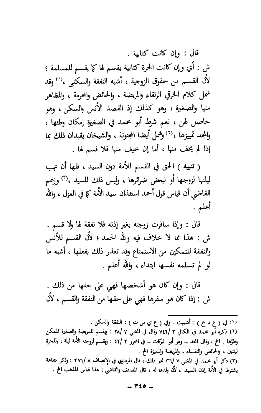 (تنبيه) : الحق في القسم للأمة دون السيد، فلها أن تهب ليلتها لزوجها أو لبعض ضرائرها، وليس ذلك للسيد، وزعم القاضي أن قياس قول أحمد استئذان سيد الأمة كما في العزل، والله أعلم.
