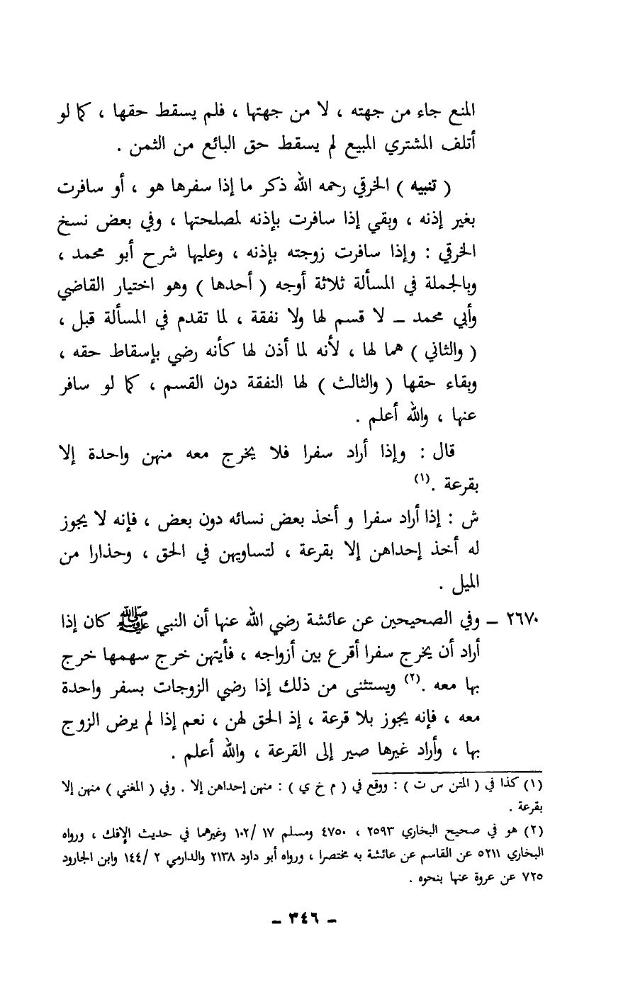 2670 - وفي الصحيحين عن عائشة - رَضِيَ اللَّهُ عَنْهَا - «أن النبي - صَلَّى اللَّهُ عَلَيْهِ وَسَلَّمَ - كان إذا أراد أن يخرج سفرا أقرع بين أزواجه، فأيتهن خرج سهمها خرج بها معه» . ويستثنى من ذلك إذا رضي الزوجات بسفر واحدة معه، فإنه يجوز بلا قرعة، إذ الحق لهن، نعم إذا لم يرض الزوج بها، وأراد غيرها صير إلى القرعة، والله أعلم.