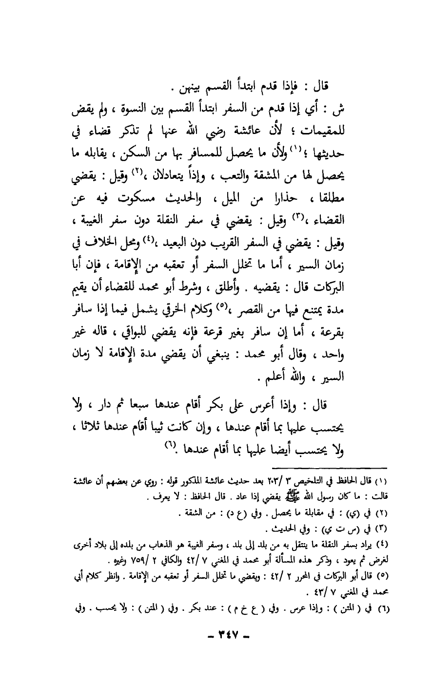 ش: أي إذا قدم من السفر ابتدأ القسم بين النسوة، ولم يقض للمقيمات؛ لأن عائشة - رَضِيَ اللَّهُ عَنْهَا - لم تذكر قضاء في حديثها؛ ولأن ما يحصل للمسافر بها من السكن، يقابله ما يحصل لها من المشقة والتعب، والحديث مسكوت فيه عن القضاء، وقيل: يقضي في سفر النقلة دون سفر الغيبة، وقيل: يقضي في السفر القريب دون البعيد، ومحل الخلاف في زمان السير، أما ما تخلل السفر أو تعقبه من الإقامة، فإن أبا البركات قال: يقضيه. وأطلق، وشرط أبو محمد للقضاء أن يقيم مدة يمتنع فيها من القصر، وكلام الخرقي يشمل فيما إذا سافر بقرعة، أما إن سافر بغير قرعة فإنه يقضي للبواقي، قاله غير واحد، وقال أبو محمد: ينبغي أن يقضي مدة الإقامة لا زمان السير، والله أعلم.