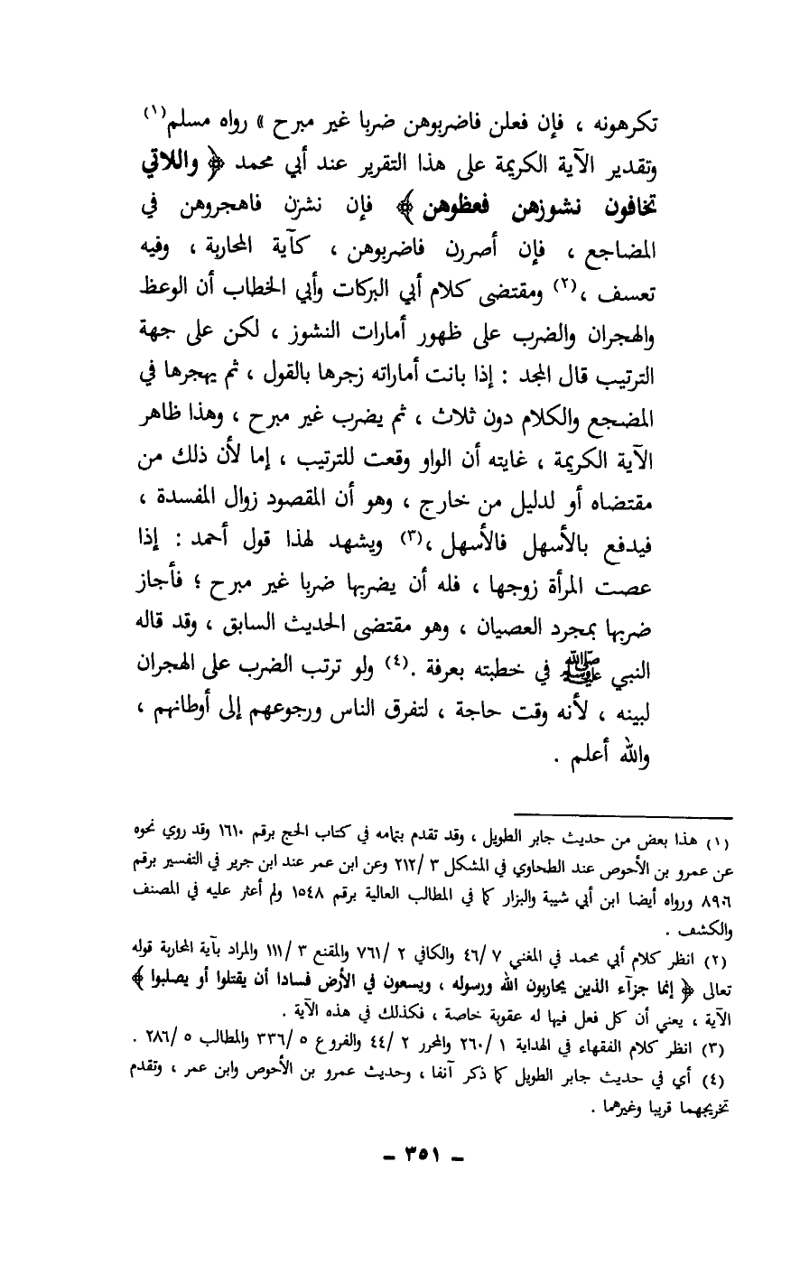 تكرهونه، فإن فعلن فاضربوهن ضربا غير مبرح» رواه مسلم، وتقدير الآية الكريمة على هذا التقرير عند أبي محمد: {وَاللَّاتِي تَخَافُونَ نُشُوزَهُنَّ فَعِظُوهُنَّ} [النساء: 34] فإن نشزن فاهجروهن في المضاجع، فإن أصررن فاضربوهن، كآية المحاربة، وفيه تعسف، ومقتضى كلام أبي البركات وأبي الخطاب أن الوعظ والهجران والضرب على ظهور أمارات النشوز، لكن على جهة الترتيب قال المجد: إذا بانت أماراته زجرها بالقول، ثم يهجرها في المضجع والكلام دون ثلاث، ثم يضرب غير مبرح، وهذا ظاهر الآية الكريمة، غايته أن الواو وقعت للترتيب، إما لأن ذلك من مقتضاه أو لدليل من خارج، وهو أن المقصود زوال المفسدة، فيدفع بالأسهل فالأسهل، فله أن يضربها ضربا غير مبرح؛ فأجاز ضربها بمجرد العصيان، وهو مقتضى الحديث السابق، وقد قاله النبي - صَلَّى اللَّهُ عَلَيْهِ وَسَلَّمَ - في خطبته بعرفة. ولو ترتب الضرب على الهجران لبينه، لأنه وقت حاجة، لتفرق الناس ورجوعهم إلى أوطانهم، والله أعلم.