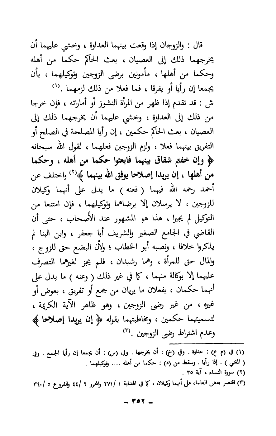 قال: والزوجان إذا وقعت بينهما العداوة، وخشي عليهما أن يخرجهما ذلك إلى العصيان، بعث الحاكم حكما من أهله وحكما من أهلها، مأمونين برضى الزوجين وتوكيلهما، بأن يجمعا إن رأيا أو يفرقا، فما فعلا من ذلك لزمهما.