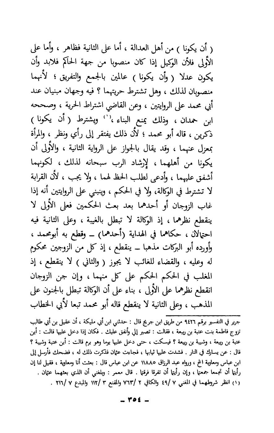 أن يكونا) من أهل العدالة، أما على الثانية فظاهر، وأما على الأولى فلأن الوكيل إذا كان منصوبا من جهة الحاكم فلا بد وأن يكون عدلا (وأن يكونا) عالمين بالجمع والتفريق؛ لأنهما منصوبان لذلك، وهل تشترط حريتهما؟ فيه وجهان مبنيان عند أبي محمد على الروايتين، وعن القاضي اشتراط الحرية، وصححه ابن حمدان، وذلك يمنع البناء، ويشترط (أن يكونا) ذكرين، قاله أبو محمد؛ لأن ذلك يفتقر إلى رأي ونظر، والمرأة بمعزل عنهما، وقد يقال بالجواز على الرواية الثانية، والأولى أن يكونا من أهلهما، لإرشاد الرب سبحانه لذلك، لكونهما أشفق عليهما، وأدعى لطلب الحظ لهما، ولا يجب، لأن القرابة لا تشترط في الوكالة، ولا في الحكم، وينبني على الروايتين أنه إذا غاب الزوجان أو أحدهما بعد بعث الحكمين فعلى الأولى لا ينقطع نظرهما، إذ الوكالة لا تبطل بالغيبة، وعلى الثانية فيه احتمالان، حكاهما في الهداية (أحدهما) - وقطع به أبو محمد، وأورده أبو البركات مذهبا -: ينقطع، إذ كل من الزوجين محكوم له وعليه، والقضاء للغائب لا يجوز؛ (والثاني) : لا ينقطع، إذ المغلب في الحكم الحكم على كل منهما، وإن جن الزوجان انقطع نظرهما على الأولى، بناء على أن الوكالة تبطل بالجنون على المذهب، وعلى الثانية لا ينقطع قاله أبو محمد تبعا لأبي الخطاب